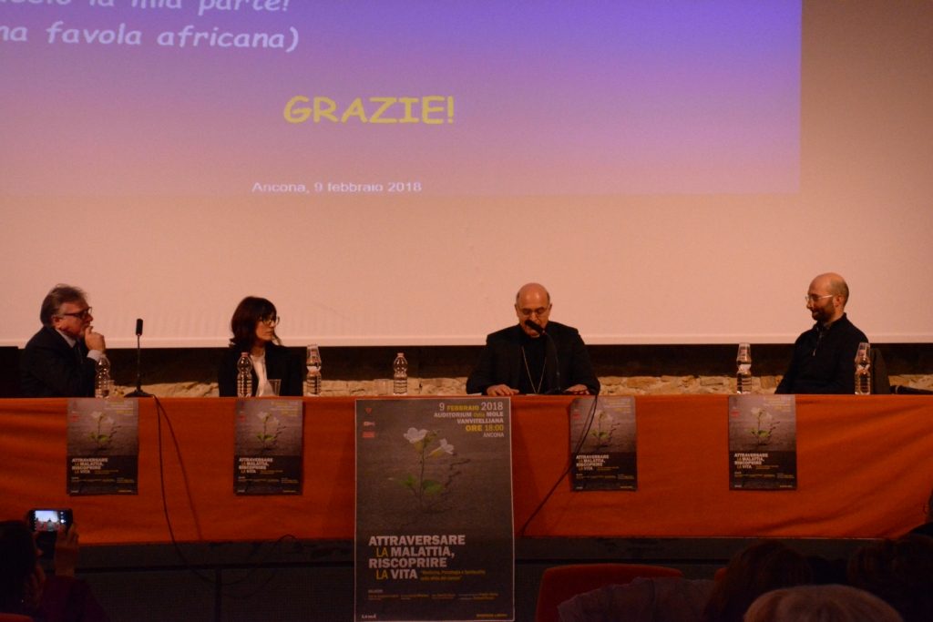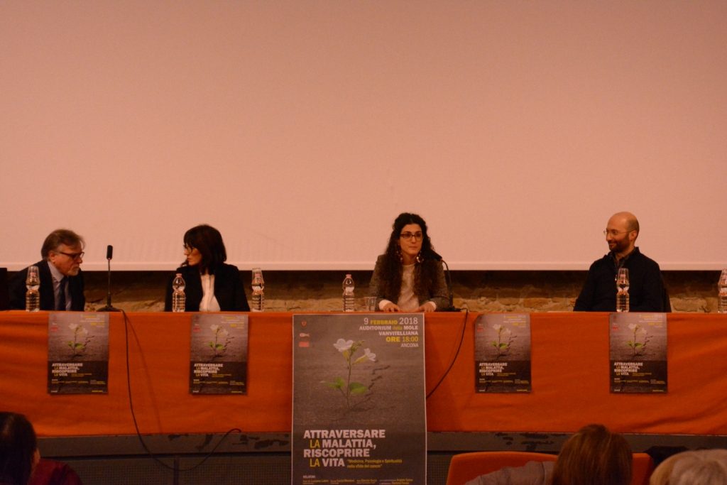 Alla Mole Vanvitelliana di Ancona si é svolto un incontro a più voci per affrontare il tema delicato della malattia oncologica declinato nei suoi varo aspetti. L’oncologo, prof. LUCIANO LATINI, ne ha sviluppato gli aspetti scientifici, ponendo l’accento sull’importanza della ricerca italiana in campo oncologico; sui farmaci antitumorali e sul futuro dell’oncologia.L’aspetto più squisitamente psicologico è stato affrontato dalla dottoressa LUCIA MONTESI (psicologa e psicoterapeuta dell’U.O. Oncologia Area Vasta di Macerata) che ha delineato le tappe emozionali che vive il malato nell’attraversare la malattia.Don DAVIDE DUCA, parroco del SS Crocifisso agli Archi di Ancona, ha sottolineato come nel malato oncologico cambi in modo profondo il rapporto col trascendente.