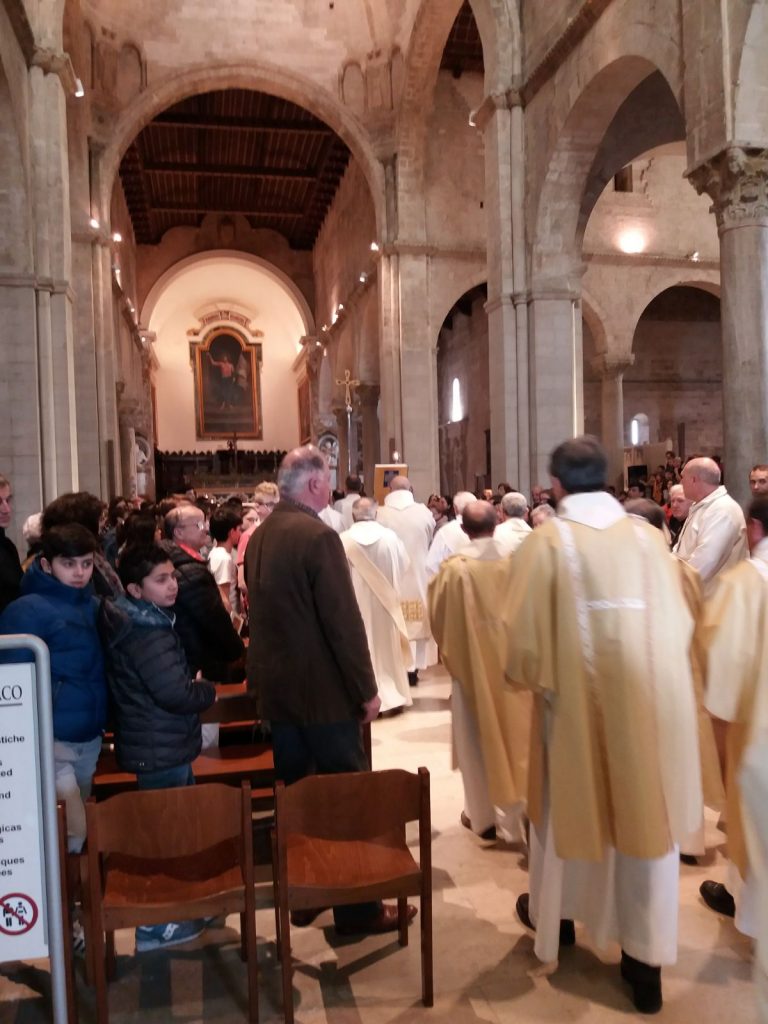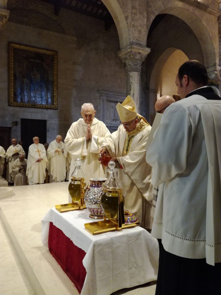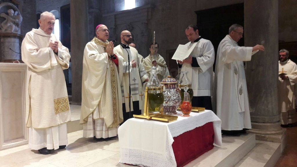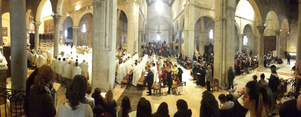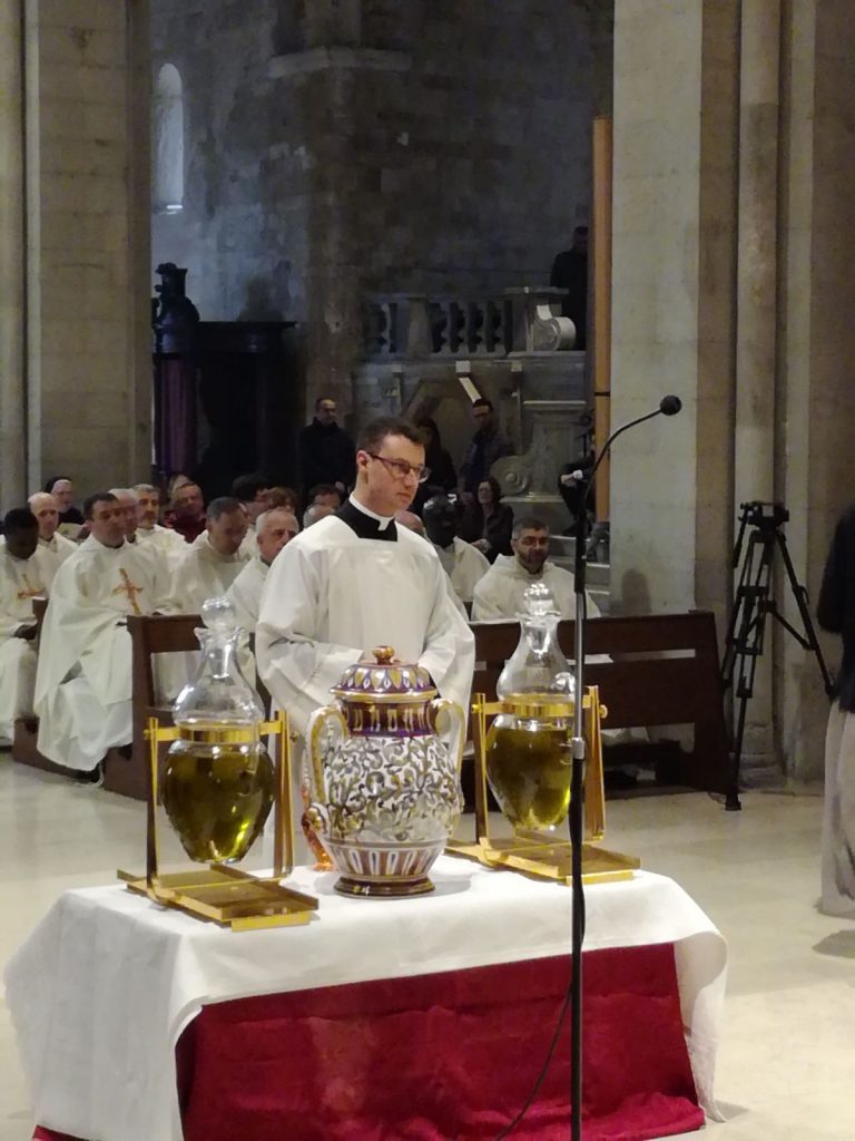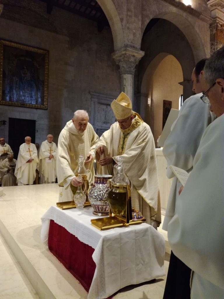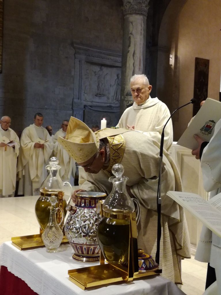 Il giovedì santo, nella mattinata, tutto il presbiterio della diocesi, con i fedeli, si è ritrovato unito al suo arcivescovo in cattedrale per la celebrazione della messa crismale una delle principali manifestazioni della pienezza del sacerdozio del Vescovo e un segno della stretta unione dei presbiteri con lui. La Messa crismale è quasi epifania della Chiesa, corpo di Cristo, organicamente strutturato, che nei vari ministeri e carismi esprime, per la grazia dello Spirito, i doni nuziali di Cristo alla sua sposa pellegrina nel mondo. La Messa crismale, rende ancor più evidente il clima di una vera festa del sacerdozio ministeriale all’interno di tutto il popolo sacerdotale e orienta l’attenzione verso il Cristo, il cui nome significa «consacrato per mezzo dell’unzione».