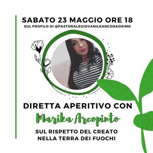 In occasione di questa settimana, la Pastorale Giovanile mercoledì ha organizzato la sfida “The Challenge”, proprio sul tema della cura del Creato, riflettendo sulle parole del Papa: “Che tipo di mondo vogliamo lasciare a quelli che verranno dopo di noi”? Inoltre la PG ha deciso di invitare alla diretta Instagram Marika Arcopinto che, sabato 23 maggio alle ore 18, parlerà della Terra dei Fuochi, la sua terra martoriata dalla camorra.