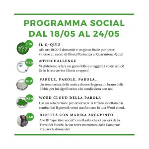 Tra le altre iniziative organizzate dalla PG, tornano giovedì 21 maggio “Parole, Parole, Parola”, con un seminarista della nostra Arcidiocesi che leggerà un brano della Bibbia per lui significativo e lo condividerà con i giovani, e venerdì 22 maggio “Word Cloud della Parola“: i giovani saranno invitati ad usare un solo termine per descrivere la lettura ascoltata il giovedì e verrà creata una Word Cloud, una nuvola virtuale in cui compariranno tutti i termini indicati dai ragazzi.