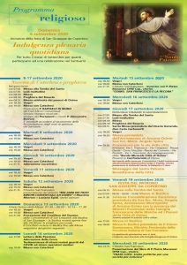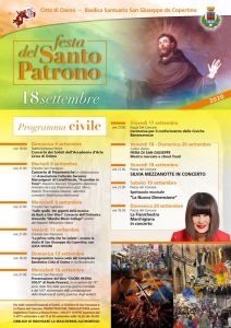 Dall’8 al 17 settembre 2020 ad Osimo una serie di eventi che si intrecciano sul piano civile e quello religioso per la festa del patrono S.Giuseppe da Copertino, eventi che culminano il giovedì 17 con la festa delle Stimmate di S.Francesco, giornata che prevede tra l’altro, la processione e la benedizione alla città. Il venerdi 18, si celebra la festa del Patrono. In basilica, alle ore 11: 30 S.Messa concelebrata dal nostro arcivescovo Angelo Spina con la presenza dei Ministri provinciali delle Marche, dei parroci della città di Osimo e delle Autorità civili.