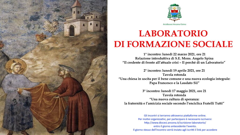 Siamo tutti consapevoli delle difficoltà a relazionarci in presenza in questo periodo di pandemia da Covid-19. Tuttavia noi abbiamo ritenuto di non fermarci e, su sollecitazione del nostro Arcivescovo, abbiamo pensato di incontrarci in videoconferenza utilizzando i mezzi informatici che abbiamo a disposizione per un primo breve ciclo di eventi formativi di primavera, che poi riprenderemo in autunno. Durante il primo di essi spiegheremo meglio il perché di un Laboratorio di formazione sociale che in questo primo ciclo avrà il seguente programma: