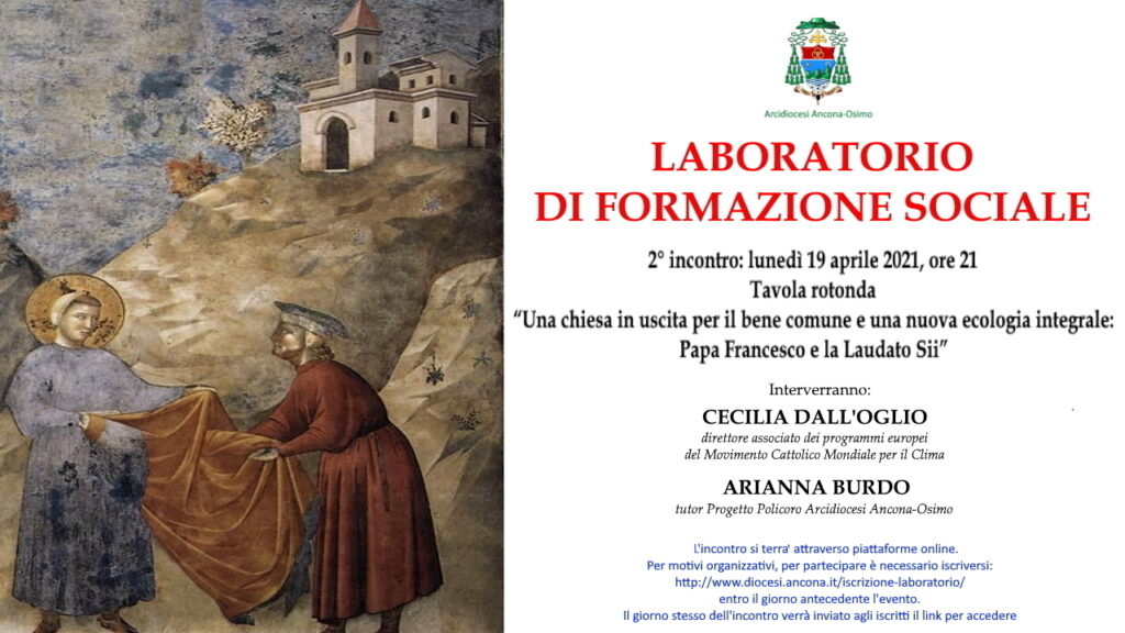 Lunedì 19 aprile prossimo alle ore 21 ci sarà, come da programma, il 2° incontro online del Laboratorio di formazione sociale. Sarà una Tavola rotonda sul tema: “Una Chiesa in uscita per il bene comune e una nuova ecologia integrale: Papa Francesco e la Laudato Sii” con la speciale e gradita partecipazione di Cecilia Dall’Oglio, direttore associato dei programmi europei del Movimento Cattolico Mondiale per il Clima (sorella di Padre Paolo, gesuita rapito in Siria nel 2013) e Arianna Burdo, tutor del Progetto Policoro della nostra diocesi. Essendo una Tavola rotonda è possibile e gradita una fruttuosa interazione tra i partecipanti; l’argomento d’altra parte è molto interessante e stimola il dialogo.