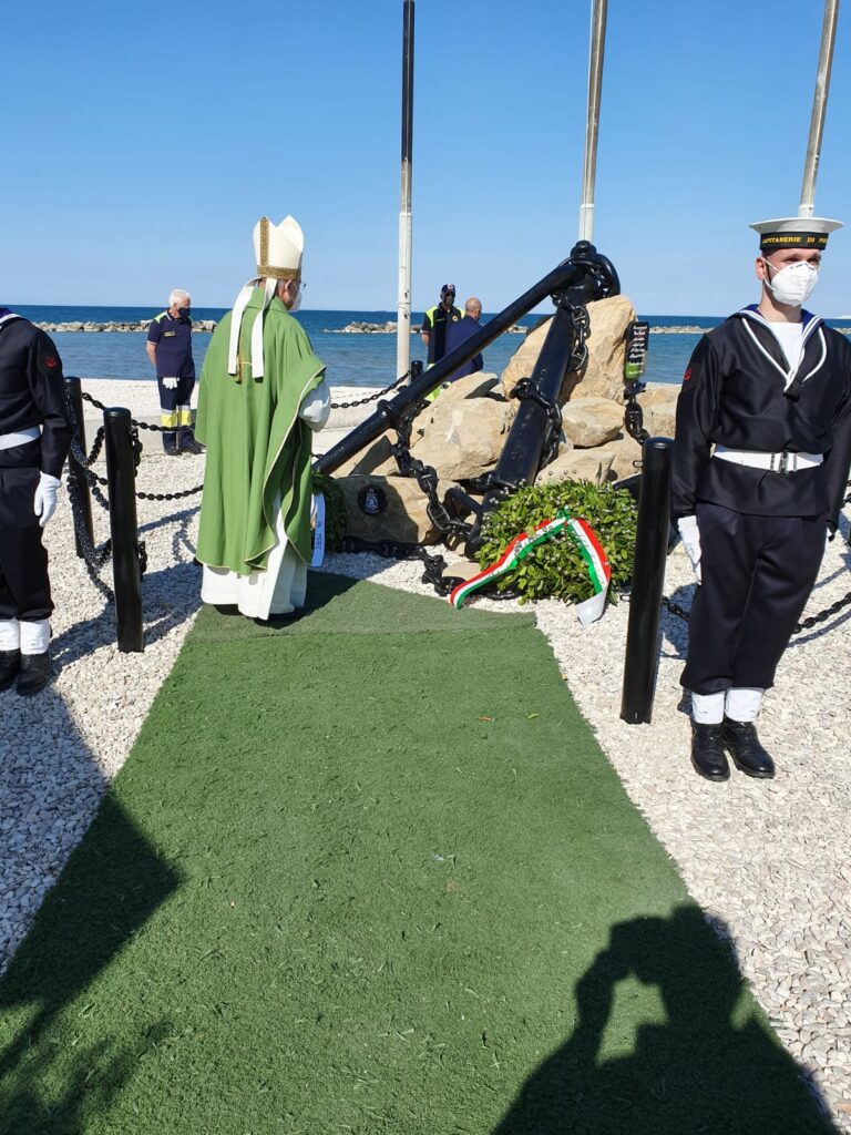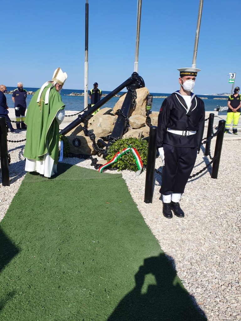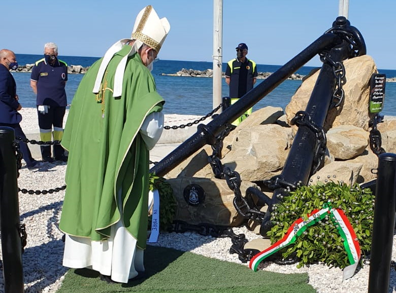 E’ stato un pomeriggio ricco di emozioni quello di ieri, 2 giugno, sulla spiaggia di Villanova, grazie all’inaugurazione del Monumento ai caduti del mare e all’eroe falconarese della Prima guerra mondiale, Bruno Santarelli. La cerimonia di inaugurazione, organizzata dalla Lega Navale Falconara in collaborazione con il Comune, è stata aperta da monsignor Angelo Spina, arcivescovo di Ancona-Osimo, che ha celebrato la messa in spiaggia e ha benedetto la grande ancora installata in riva al mare, ai margini della piazzetta davanti all’ex Tiro a volo. “Ringrazio per questo invito – ha detto l’Arcivescovo – la brezza di vento, lo stare all’aperto, pur nel rispetto delle norme Covid, ci fa sentire più liberi e ci apre alla speranza. In questa S. Messa ricordiamo quanti sono morti in mare e tanti che continuano a morire, nella grande indifferenza di chi ha responsabilità, il Signore ricco di misericordia accolga le loro anime nella sua pace e doni a noi la grazia di essere strumenti di pace e di solidarietà”.