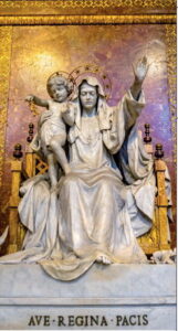 Nella vita, quando la strada si fa buia e i problemi sembrano senza rimedio, diventa quasi naturale cercare rifugio tra le braccia materne. Un porto sicuro, in cui trovare aiuto e sostegno, dove spegnare l’angoscia e aprire gli occhi davanti a una possibile via di uscita. Per la Chiesa è lo stesso, nei momenti più duri si invoca la Madre, le si domanda conforto, e di portare al Signore i dubbi e le richieste nascosti dentro l’anima, affinché li purifichi secondo la sua volontà. Così, naturalmente, in tempo di guerra il primo pensiero va alla fine del conflitto. E allora diventa normale, quasi obbligato guardare alla Regina della Pace. Lo farà il Papa martedì prossimo. Il 31 maggio alle 18 a conclusione del mese tradizionalmente dedicato ala Vergine, il Pontefice reciterà la preghiera del Rosario davanti alla statua di Maria Regina Pacis in Santa Maria Maggiore a Roma. Si tratta della scultura, voluta da Benedetto XV e realizzata da Guido Galli, posta nella navata sinistra della Basilica Liberiana. La Vergine vi è rappresentata con il braccio sinistro alzato come a ordinare la fine della guerra, mentre con quello destro tiene il Bambin Gesù, pronto a far cadere il ramoscello di ulivo simboleggiante la pace. Sul basamento sono scolpiti dei fiori, a raffigurare il ritorno della vita. Quando le si avvicinano, è tradizione che i fedeli depongano ai piedi della Vergine dei piccoli biglietti scritti a mano affidandole i problemi che hanno nel cuore. Lo farà anche il Papa, portando una corona di fiori e chiedendo a Maria di aiutare l’umanità, malgrado tutto, a non perdere la speranza. La scelta del luogo della preghiera non è casuale. A parte il legame del Papa con la Basilica romana, dove si reca alla partenza e al ritorno da ogni viaggio apostolico, la statua fu realizzata nel 1918 proprio per chiedere la fine del conflitto, in quel caso della Prima Guerra mondiale.