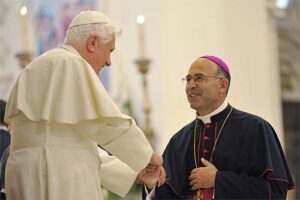 Durante l’udienza generale del mercoledì Papa Francesco ha rivolto questo invito:  «Vorrei chiedere a tutti voi una preghiera speciale per il Papa emerito Benedetto, che nel silenzio sta sostenendo la Chiesa». Ha chiesto in particolare di «ricordarlo, è molto ammalato, chiedendo al Signore che lo consoli, che lo sostenga in questa testimonianza di amore alla Chiesa, fino alla fine». La nostra arcidiocesi di Ancona-Osimo accoglie l’invito di papa Francesco, in questo momento di sofferenza e di prova, e si stringe attorno al Papa emerito, accogliendo anche l’invito del Presidente della CEI <<assicuriamo il ricordo nella preghiera nelle nostre Chiese, nella consapevolezza, come lui stesso ebbe a ricordarci, che “per quanto dure siano le prove, difficili i problemi, pesante la sofferenza, non cadremo mai fuori delle mani di Dio, quelle mani che ci hanno creato, ci sostengono e ci accompagnano nel cammino dell’esistenza, perché guidate da un amore infinito e fedele”. Il suo restare “in modo nuovo presso il Signore Crocifisso”, continuando ad “accompagnare il cammino della Chiesa con la preghiera e la riflessione” costituisce un messaggio forte per la comunità ecclesiale e per l’intera società>>. +Angelo