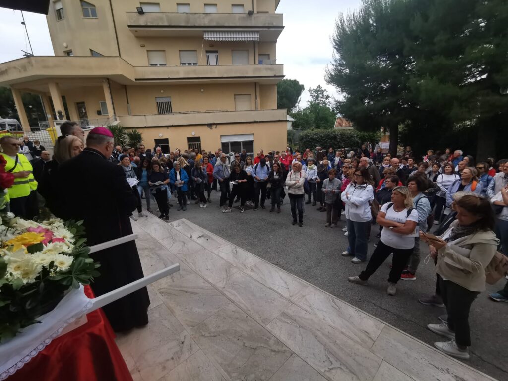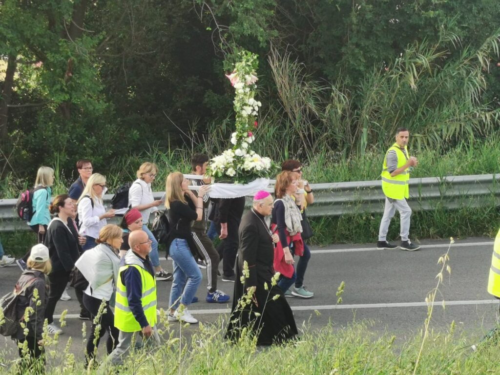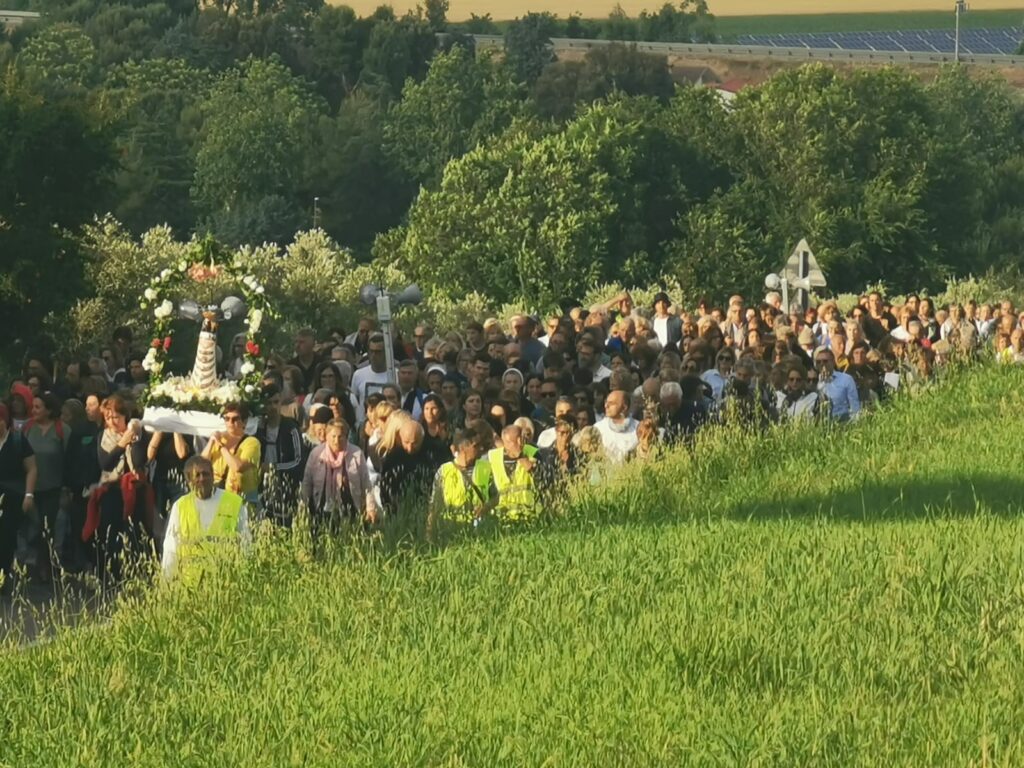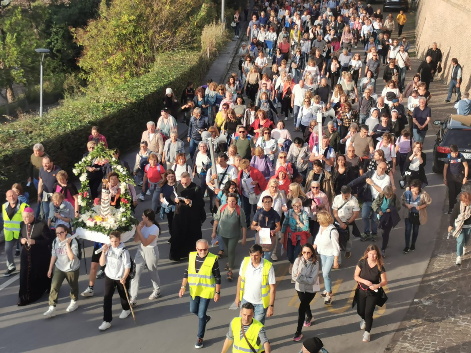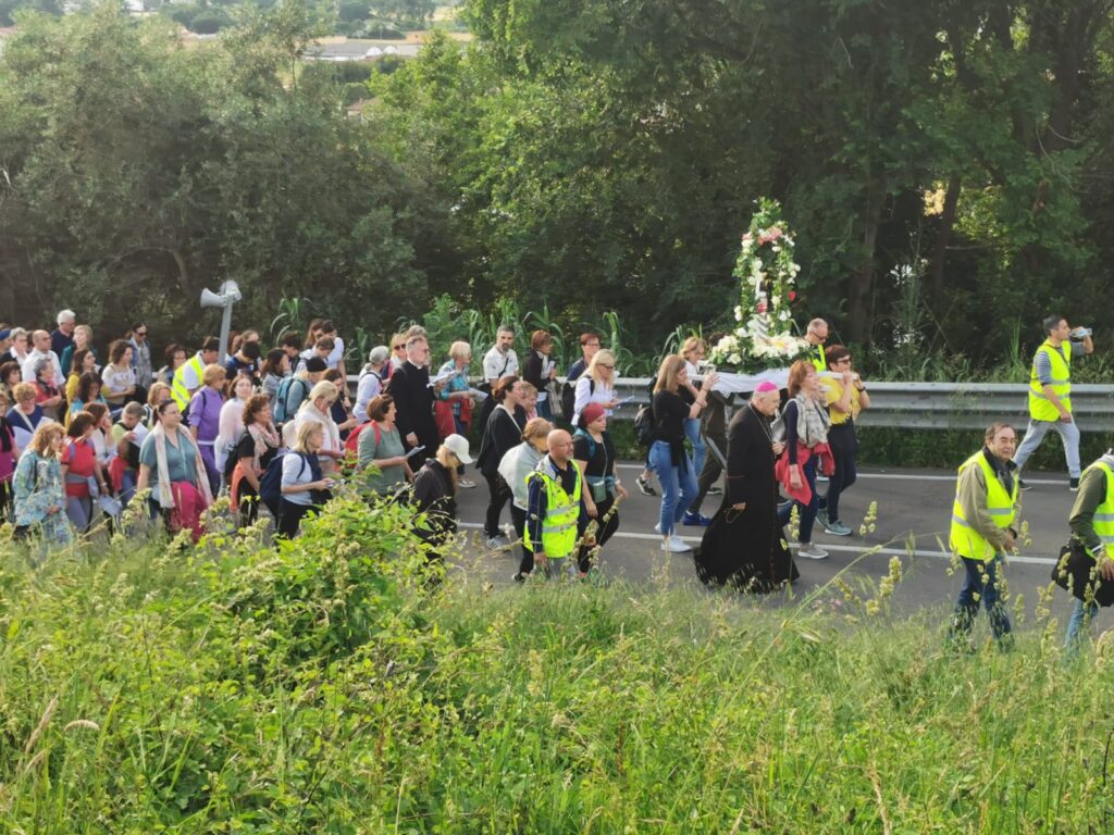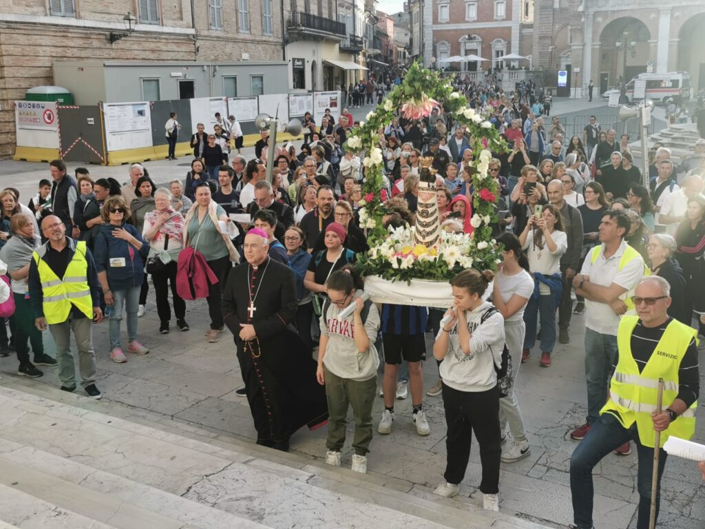Il meteo prevedeva pioggia, ma il tempo minaccioso non ha fermato le otre mille persone che si sono ritrovate presso la parrocchia di Crocette, a Cstelfidardo, per iniziare il cammino a piedi fino alla Santa Casa di Loreto. Dopo i saluti da parte dell’Assessore al comune di Castelfidardo, del parroco don Franco, l’arcivescovo Angelo ha salutato i fedeli e ringraziato quanti si sono impegnati ad organizzare il pellegrinaggio. Prima della partenza ha detto:<<Il pellegrinaggio diocesano Crocette (Castelfidardo) – Loreto, è un dono di grazia per tutti noi, soprattutto in questo anno che ci prepara al Giubileo del 2025, anno dedicato alla preghiera. Tutti dobbiamo recuperare il desiderio di stare alla presenza del Signore in preghiera, ascoltarlo e adorarlo. Nel nostro tempo c’è uno scenario mondiale non sereno. La crisi ecologica-economica-sociale aggravata dalla recente pandemia; le guerre, che seminano morte, distruzione e povertà; la cultura dell’indifferenza e dello scarto che tende a soffocare le aspirazioni di pace e di solidarietà e a emarginare Dio dalla vita personale e sociale. La preghiera è il respiro della fede, è la sua espressione più propria. Come un grido silenzioso che esce dal cuore di chi crede e si affida a Dio. Con la preghiera possiamo sollevare il mondo. E allora! Camminiamo insieme, pregando, cantando, portando tutta la nostra vita e il nostro tempo con le angosce e le tristezze, le gioie e le speranze ai piedi della Madonna, a Loreto, alla Santa Casa, luogo teologico dove dal “sì” di Maria, Dio si è fatto carne. Recitiamo con fede il santo Rosario. Il contenuto del Rosario è il volto di Cristo contemplato con gli occhi e con il cuore di Maria. Esso si è rivelato una preghiera alla portata di tutti, ed insieme preghiera capace di far innalzare l’animo verso le vette della più alta contemplazione. La vita è come un viaggio sul mare della storia, spesso oscuro ed in burrasca, un viaggio nel quale scrutiamo gli astri che ci indicano la rotta. Gesù Cristo è la luce del mondo, il sole sorto sopra tutte le tenebre della storia. Ma per giungere fino a Lui abbiamo bisogno anche di luci vicine – di persone che donano luce traendola dalla sua luce ed offrono così orientamento per la nostra traversata. E quale persona potrebbe più di Maria essere per noi stella di speranza – lei che con il suo «sì» aprì a Dio stesso la porta del nostro mondo; lei che diventò la vivente Arca dell’Alleanza, in cui Dio si fece carne, divenne uno di noi, piantò la sua tenda in mezzo a noi (cfr. Gv 1,14)?» «Così tu rimani in mezzo ai discepoli come la loro Madre, come Madre della speranza. Santa Maria, Madre di Dio, Madre nostra, insegnaci a credere, sperare ed amare con te. Indicaci la via verso il Suo regno! Stella del mare, brilla su di noi e guidaci» (Spei Salvi, 50). Dona a questa umanità ferita il dono della pace. A tutti buon pellegrinaggio!>>.