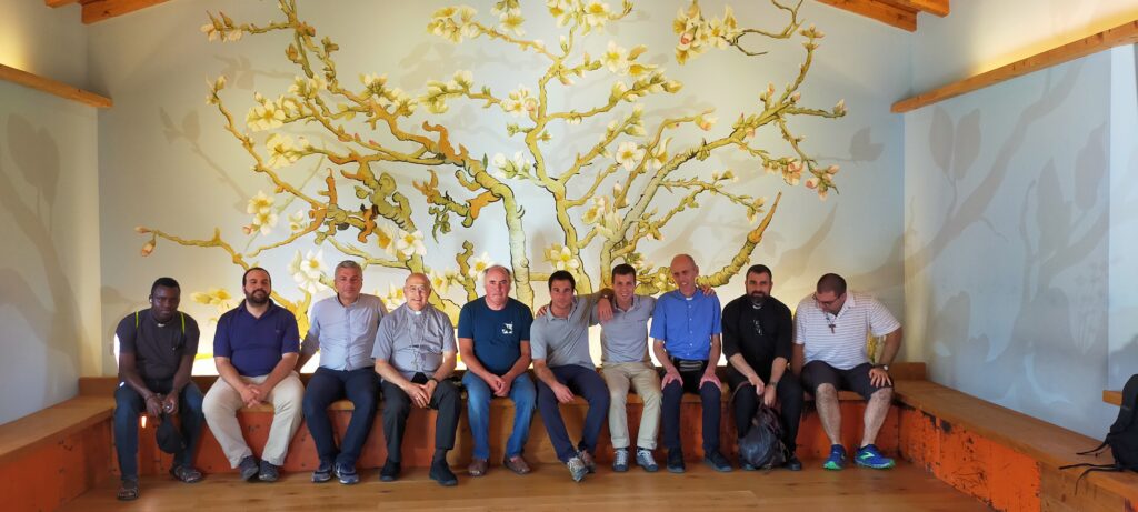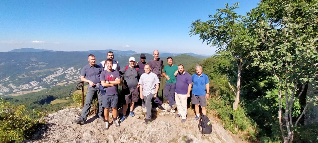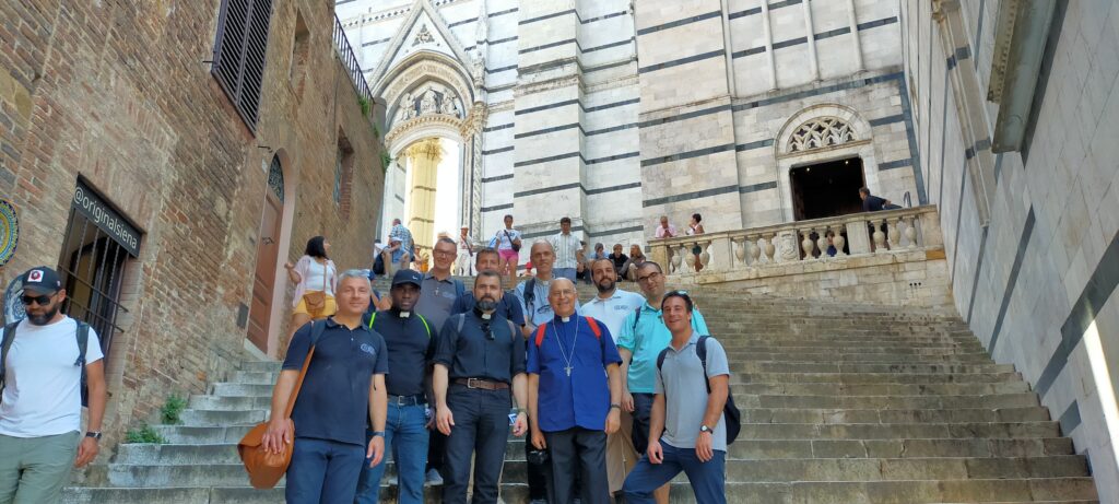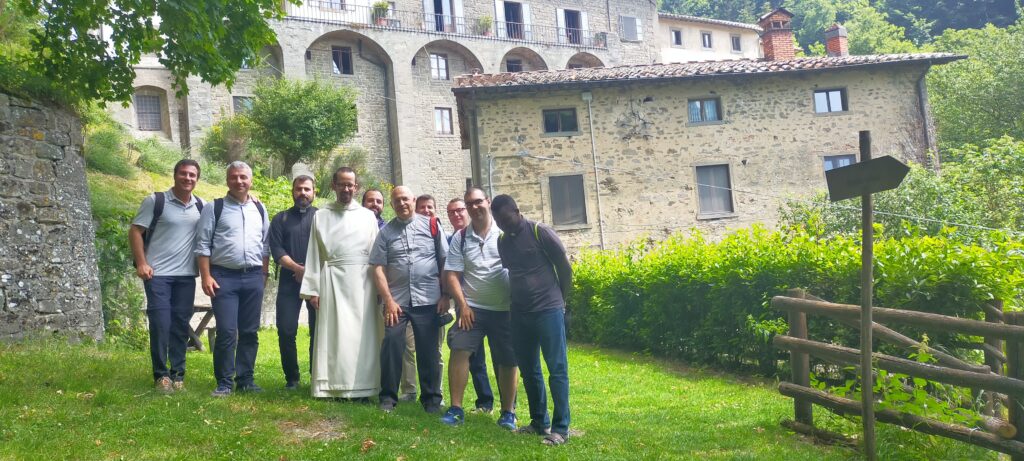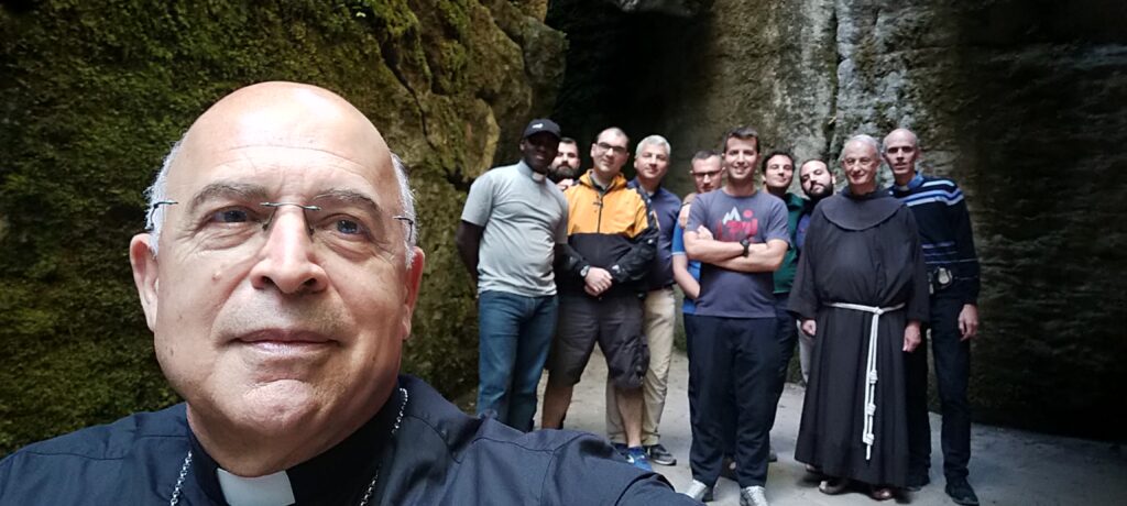 Un cammino iniziato a La Verna, luogo dove San Francesco ricevette le stimmate nel 1224, di cui ricorrono gli ottocento anni. Il tempo, trascorso insieme in fraternità, è stato scandito da diverse tappe, dopo quella a Città di Castello con l’incontro con il vescovo Luciano Paolucci Bedini, originario di Ancona, ci si è recati a Siena per visitare il santuario di santa Caterina e celebrare l’eucaristia, visitare la chiesa di S. Francesco, la cattedrale e fare una visita alla Fraternità di Romena. Altra tappa è stata la visita al monastero di Camaldoli e all’eremo. Ci si è scoperti pellegrini sulle vie di santità tracciate da uomini e donne che hanno testimoniato l’amore a Dio e ai fratelli. Intensa e partecipata è stata la giornata scandita dalle ore vissute con la comunità francescana, a partire dalla visita ai luoghi di La Verna guidati da fra Paolo, con le riflessioni tenute al Sasso Spicco della Verna dove, due anni prima della sua morte, san Francesco ebbe impresse nel suo corpo le piaghe della gloriosa passione di Cristo. Il suo cammino di discepolo lo aveva portato ad una unione così profonda con il Signore da condividerne anche i segni esteriori del supremo atto di amore della Croce. Nel mese di settembre del 1224 si stava realizzando un avvenimento che mai si era verificato nella carne di un uomo: l’impressione delle Stimmate di Cristo crocifisso, “l’ultimo sigillo”, le definì Dante. Dell’apparizione del Serafino ci offre un’ampia descrizione il biografo di Francesco, Tommaso da Celano: “Gli apparve un uomo, in forma di Serafino, con le ali, librato sopra di lui, con le mani distese ed i piedi uniti, confitto ad una croce… Cercava con ardore di scoprire il senso della visione, e per questo il suo spirito era tutto agitato. Mentre era in questo stato di preoccupazione e di totale incertezza, ecco: nelle sue mani e nei piedi cominciarono a comparire gli stessi segni dei chiodi che aveva appena visto in quel misterioso uomo crocifisso. Le sue mani e i piedi apparvero trafitti nel centro da chiodi, le cui teste erano visibili nel palmo delle mani e sul dorso dei piedi, mentre le punte sporgevano dalla parte opposta…Così pure nei piedi erano impressi i segni dei chiodi sporgenti sul resto della carne. Anche il lato destro era trafitto come da un colpo di lancia, con ampia cicatrice, e spesso sanguinava, bagnando di quel sacro sangue la tonaca e le mutande”.