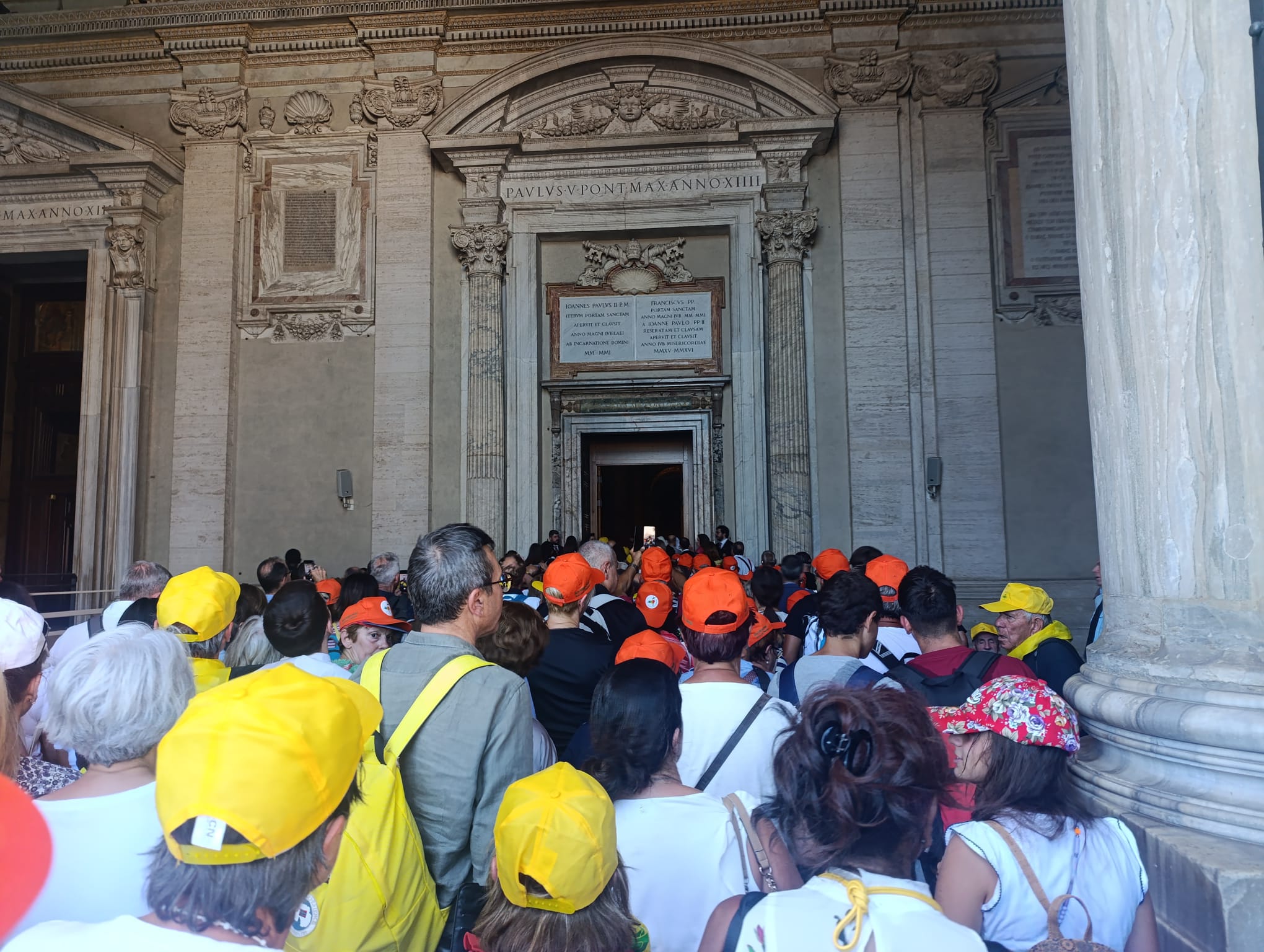 Al termine del discorso i Vescovi hanno potuto salutare il Papa. Anche i sacerdoti di Ancona e Jesi sono stati ammessi al baciamano con la grande emozione dei due diaconi David e Jacopo che hanno detto al Papa di pregare per loro in quanto sabato 27 settembre verranno ordinati presbiteri. È iniziata la lunga fila, sotto il sole, per attraversare la porta santa. È stato un vero cammino penitenziale a passo lento, con lunghe soste, con la preghiera e la gioia di attraversare la porta santa della Basilica. È seguita la celebrazione della Santa Messa dall’altare papale della Confessione, presieduta dall’Arcivescovo Angelo con migliaia di pellegrini, concelebrata dal Vescovo di Jesi Paolo, da quello di Cerreto Giuseppe e dai tanti sacerdoti. La celebrazione è stata animata dai cori di Ancona, Jesi e sant’Agata. Un momento di grazia per tutti. Al termine i pellegrini, a piedi si sono recati alla stazione di San Pietro per far ritorno a Jesi e ad Ancona nel buio della notte. È stato un pellegrinaggio carico di fede, di speranza con un cuore aperto alla misericordia di Dio per essere strumenti di misericordia, di pace e di bene. La stanchezza e le difficoltà non sono mancate, ma grazie alla regia di don Dino, di don Lorenzo, di don Samuele e di tanti collaboratori è andato tutto bene. I fedeli accompagnati dai loro Vescovi hanno potuto sperimentare che la speranza non delude e i doni giubilari ricevuti vanno ridonati sul paradigma del buon samaritano.