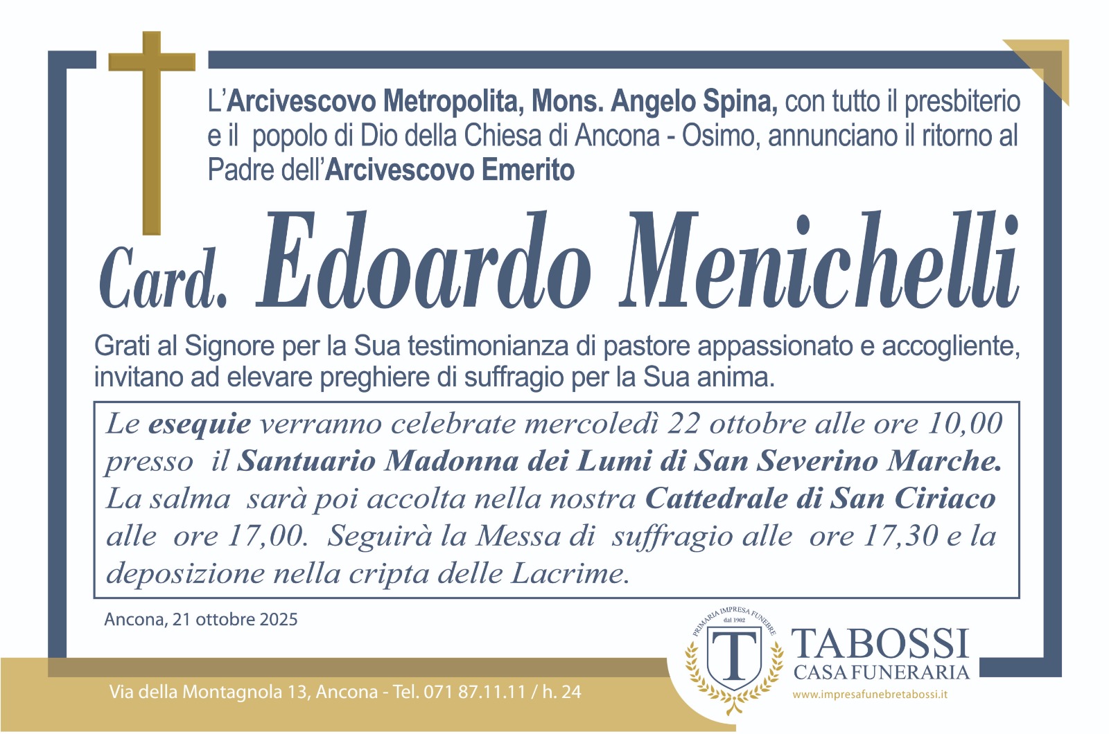 Il funerale del Cardinale Edoardo Menichelli sarà celebrato mercoledì 22 ottobre, alle ore 10, nel Santuario Madonna dei Lumi a San Severino Marche. Al termine delle esequie, il feretro sarà accompagnato ad Ancona e, secondo le disposizioni testamentarie del Cardinale, verrà tumulato nella Cattedrale di San Ciriaco. Alle ore 17 la salma sarà accolta nel Duomo di Ancona. Alle ore 17.30 Mons. Angelo Spina presiederà la Messa di suffragio che sarà trasmessa in diretta su èTV Marche (Canale 12). Seguirà la deposizione nella Cripta delle Lacrime. Grati al Signore per la sua testimonianza di pastore appassionato e accogliente, l’Arcivescovo e tutto il presbiterio invitano ad elevare preghiere di suffragio per la sua anima.