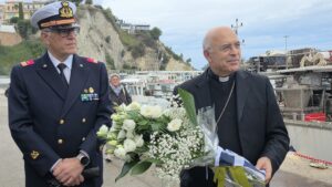Mons. Angelo Spina ha ringraziato anche tutti coloro che svolgono le loro attività sul mare, dalla pesca al mondo nautico, dalla ristorazione al turismo, e ha invitato tutti a «prendersi cura del mare. Quest’anno ricorrono gli ottocento anni dalla composizione del Cantico delle Creature di San Francesco, in cui il santo parla dell’acqua: “Laudato si’, mi’ Signore, per sor’aqua, la quale è multo utile et humile e pretiosa et casta”. Questa lode apre il cuore a guardare il nostro mare con ammirazione, come un dono di Dio e a prendercene cura». Ha poi fatto una preghiera per i caduti in mare e ha ricordato che «chiunque è in pericolo, deve essere salvato».