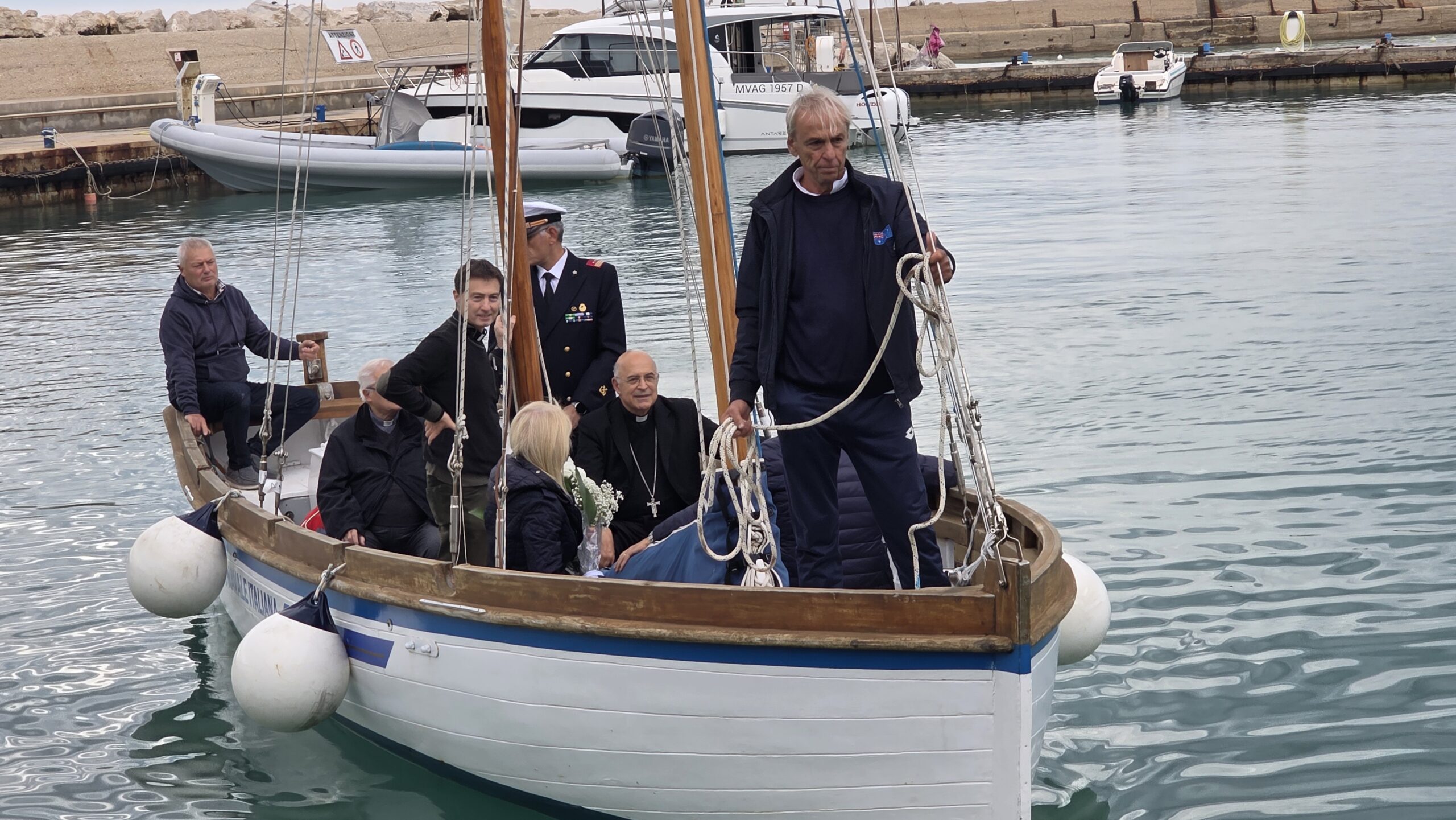 Accompagnato dal parroco don Michele e da don Enrico, l’Arcivescovo è stato accolto nel porto di Numana dal Comandante, primo Luogotenente Giancarlo Calisi, dal vicepresidente della Lega Navale di Numana Rodolfo Borsini, dal presidente del Gruppo ANMI “Romeo Romei” di Numana Marcello Babini, e dagli operatori delle varie società che operano nel porto. Mons. Angelo Spina, nel ringraziare per la calorosa accoglienza, ha ricordato con emozione il suo legame con il porto di Numana, a lui particolarmente caro. Nel 2017, infatti, in occasione del suo ingresso nell’Arcidiocesi di Ancona-Osimo, fece prima tappa a Loreto e poi raggiunse il porto di Numana, da dove si imbarcò sulla motovedetta per approdare al porto di Ancona. «Scelsi di raggiungere Ancona via mare – ha spiegato – perché in queste acque ci sono stati tre eventi importanti. Proprio dal mare, infatti, giunse da Gerusalemme il corpo di San Ciriaco; dal porto di Ancona San Francesco si imbarcò per raggiungere la Terra Santa; e il dipinto della Regina di tutti i Santi, custodito nel Duomo di Ancona, apparteneva a un marinaio e, secondo la tradizione, salvò l’equipaggio da una tempesta». Mons. Angelo Spina ha ricordato anche la tradizionale festa dell’Assunta, che si svolge ogni anno il 14 agosto al porto di Numana e che richiama sempre moltissime persone. «Questo porto rimarrà sempre nel mio cuore e nelle mie preghiere», ha affermato l’Arcivescovo.