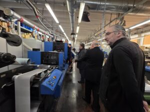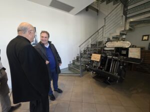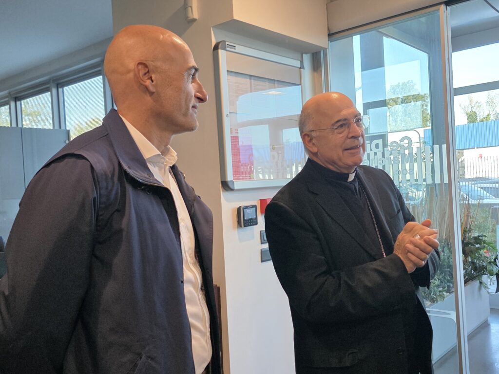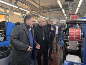 Accompagnato dal parroco don Wojciech Ulaczyk e dal sindaco Davide Fiorini, Mons. Angelo Spina ha visitato alcune imprese, a partire da CE.DI. Marche, una solida realtà distributiva con oltre 100 punti vendita “Si con te”, nelle regioni Marche e Abruzzo. Il direttore generale Michele Palatresi e il direttore acquisti Enzo Santoni hanno spiegato che l’azienda è nata circa 50 anni fa nelle Marche e che l’attenzione e il senso di responsabilità guidano la loro attività quotidiana. La visita è proseguita da Grafiche Federighi, un’azienda di famiglia nata nel 1969. L’Arcivescovo, il parroco e il Sindaco sono stati accolti dal titolare Massimo Federighi che ha mostrato gli stabilimenti dove vengono realizzate le etichette, in particolare quelle per il vino, e il primo macchinario con cui il padre Carlo iniziò questa avventura.