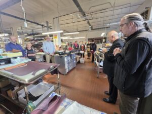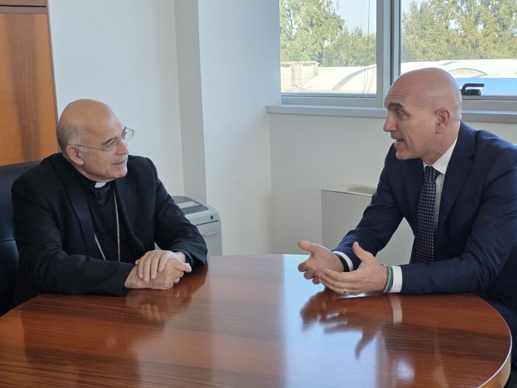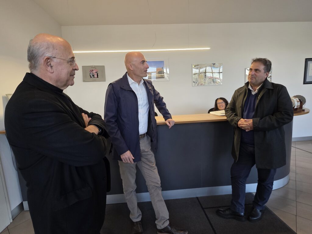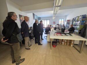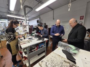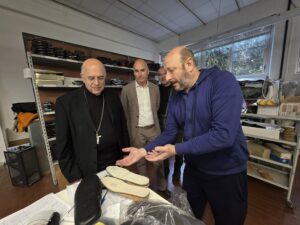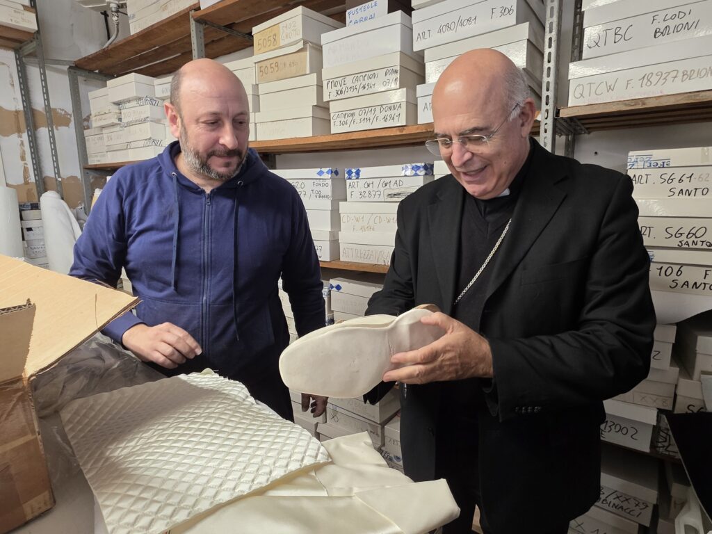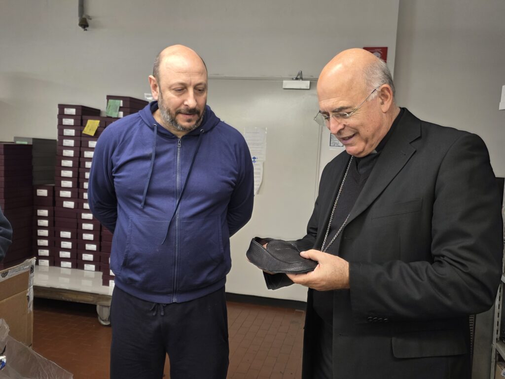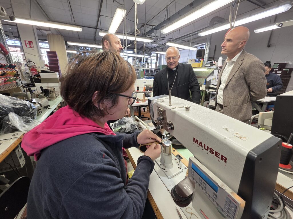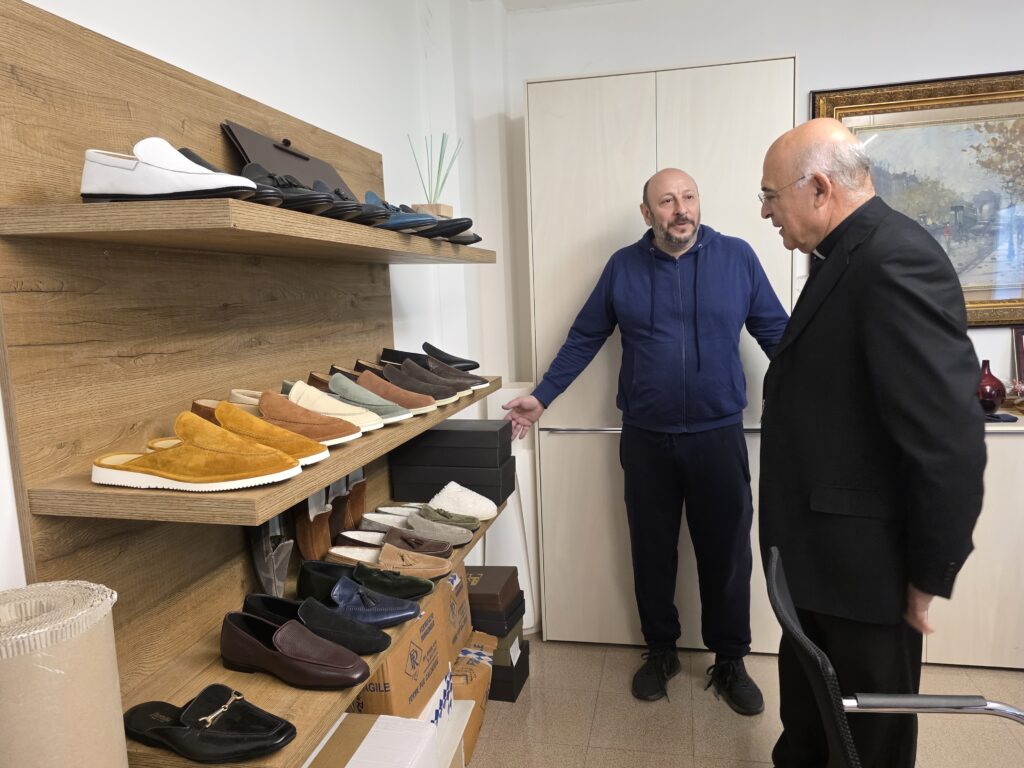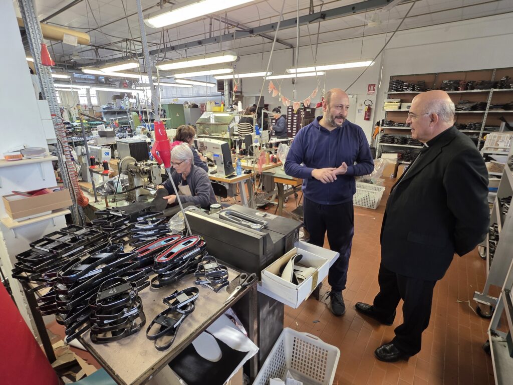 Mons. Angelo Spina ha poi visitato l’azienda Testaferri, che dal 1960 produce infissi. Accolto dal titolare Andrea e dai dipendenti si è complimentato con loro, sottolineando come gli infissi contribuiscano a migliorare la qualità delle abitazioni e a renderle più sicure. Un’altra azienda storica è Farfalla, specializzata nella produzione di calzature per la casa. I titolari Stefano e Nicola Raffaeli hanno mostrato lo stabilimento dove vengono realizzate le pantofole e hanno anche rivelato un curioso aneddoto: su commissione di un’altra azienda hanno realizzato un paio di pantofole bianche che, con ogni probabilità, sarebbero state donate a Papa Francesco.