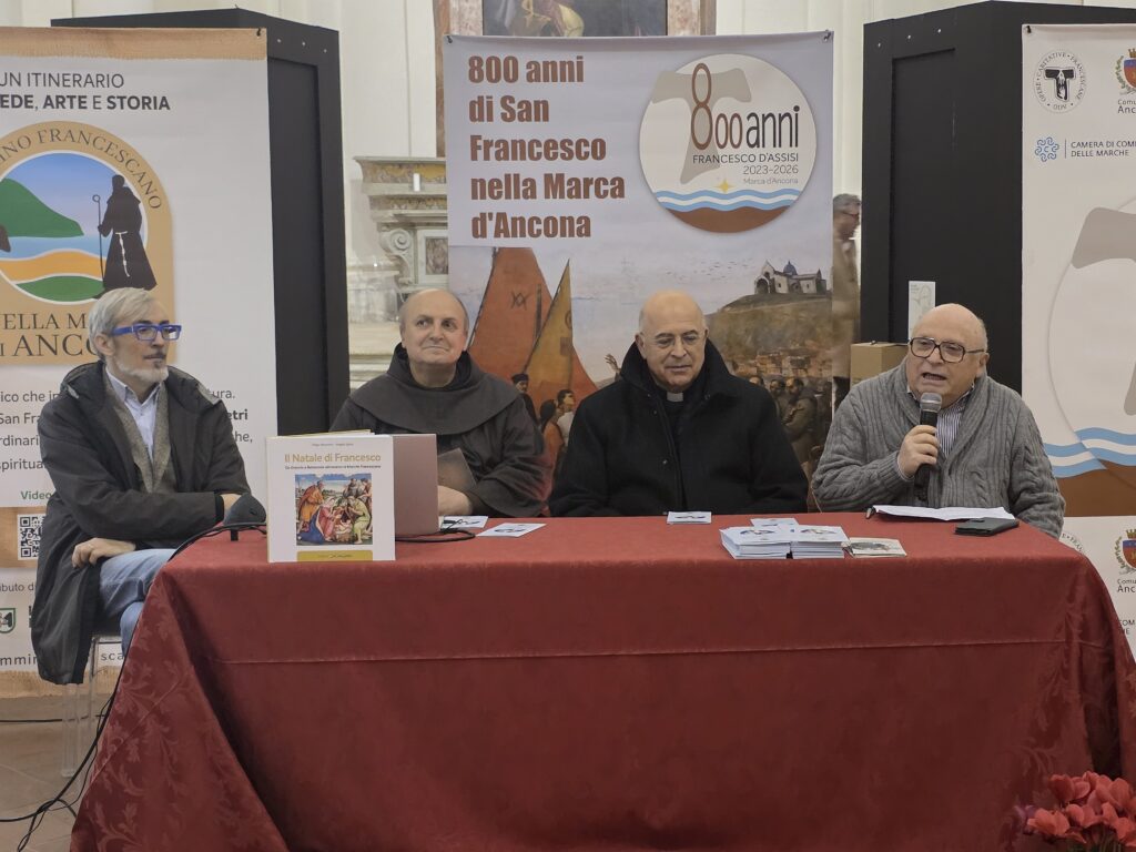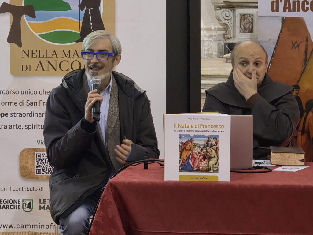 Dopo il taglio del nastro, l’inaugurazione è stata arricchita da un intermezzo musicale a cura del Mirò Saxophone Quartet, composto da Doria Del Maestro, Filippo Dionigi, Angelo Antonioli e Sabrina Esposto. L’incontro si è poi concluso con la presentazione del libro “Il Natale di Francesco”, scritto da Mons. Angelo Spina e dal giornalista Diego Mecenero, un volume che approfondisce il significato spirituale e umano del Natale secondo la tradizione francescana. Accanto a loro, il giornalista Claudio Sargenti che ha realizzato dei video di approfondimento accessibili tramite QR code all’interno del libro, e Padre Ferdinando Campana, autore di una sezione dedicata a dieci opere natalizie francescane marchigiane.