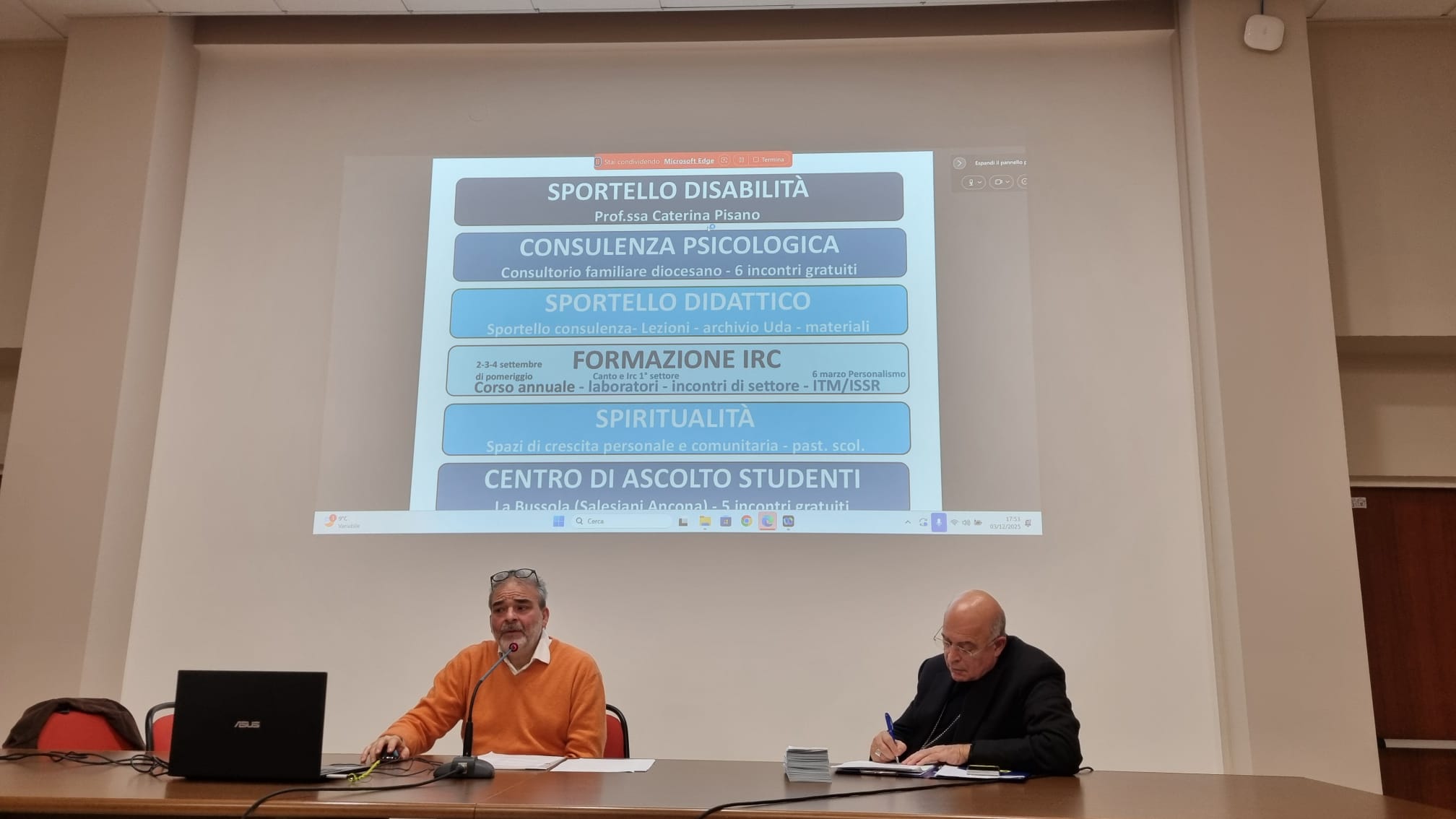 Il 3 dicembre si è tenuto l’incontro degli insegnanti di religione presso l’aula magna dell’istituto Superiore di Scienze Religiose. L’ incontro è stato aperto con un momento di preghiera. Il direttore dell’ufficio scuola diocesano, prof. Gaetano Tortorella, dopo i saluti, ha invitato l’arcivescovo Angelo a tenere la sua relazione. Il tema trattato è stato quello del cammino sinodale, del “Disegnare nuove mappe di costellazioni” e della nota l’Insegnamento della Religione cattolica: laboratorio di cultura e di dialogo. Ha ringraziato il Direttore dell’Ufficio Scuola Diocesano, tutti i docenti, invitando ad avere uno slancio positivo verso gli alunni dando speranza e aprendo spazi nuovi tenendo presente che nessun algoritmo potrà sostituire ciò che rende umana l’educazione. E’ seguito l’intervento della professoressa Caterina Pisano sul tema dell’IRC e studenti con disabilità, ha concluso l’incontro il prof. Gaetano Tortorella sul tema del burnout dell’Idr e benessere professionale, una mappa per orientare la formazione. L’incontro molto partecipato è stato un momento di crescita per tutti. L’Arcivescovo ha fatto dono a tutti del pieghevole con il messaggio natalizio 2025.