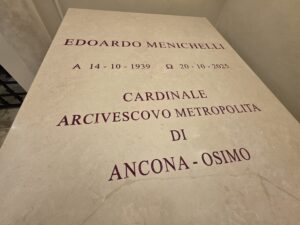 Il Cardinale Edoardo Menichelli è deceduto il 20 ottobre 2025 a San Severino Marche. Le esequie sono state celebrate la mattina del 22 ottobre nel Santuario della Madonna dei Lumi a San Severino Marche. Dopo le esequie, il feretro è stato portato nella Cattedrale di San Ciriaco ad Ancona, dove Mons. Angelo Spina ha celebrato la Santa Messa di suffragio, alla presenza dei presbiteri, dei familiari del defunto e di numerosi fedeli. Al termine della celebrazione, il feretro è stato deposto nella Cripta delle Lacrime, in attesa della sepoltura, secondo la volontà espressa pubblicamente dal Cardinale e nel suo testamento. L’Arcivescovo Angelo Spina e il Vicario Generale don Luca Bottegoni si sono attivati subito per ottenere tutte le autorizzazioni necessarie alla sepoltura. Questo ha richiesto del tempo in quanto sono state necessarie diverse documentazioni, tra cui il parere favorevole rilasciato dal Sindaco di Ancona, Daniele Silvetti, alla tumulazione della salma nella Cattedrale; l’autorizzazione della Soprintendenza alla realizzazione del sarcofago sepolcrale all’interno del Duomo; il parere favorevole rilasciato dall’Azienda Sanitaria Territoriale di Ancona sulla idoneità igienico-sanitaria del progetto; il decreto del 12 dicembre 2025 del Presidente della Giunta regionale, che ha autorizzato la tumulazione della salma nella Cattedrale.