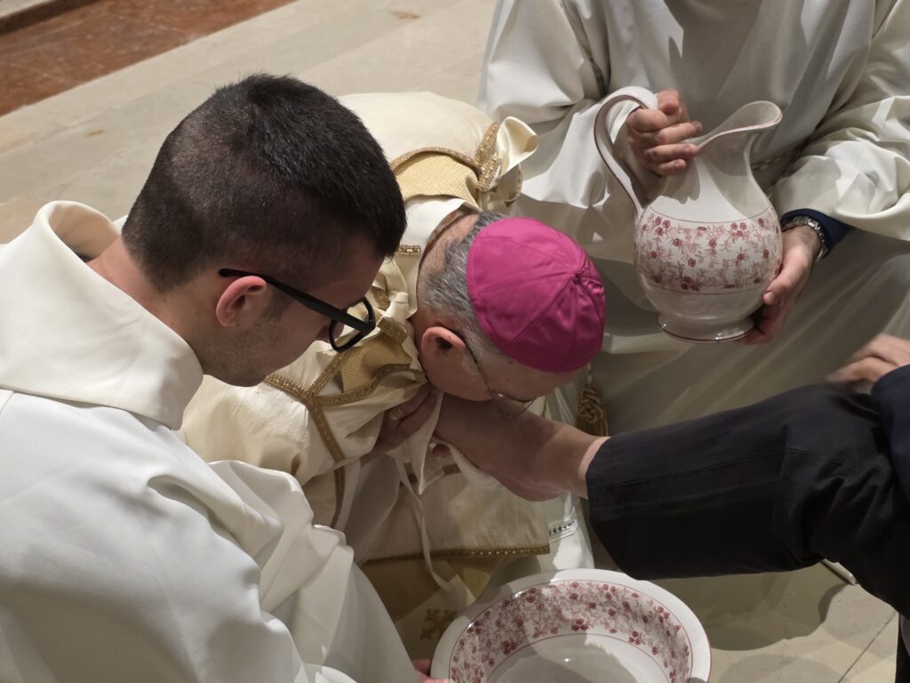 Nella Cattedrale di San Ciriaco, oggi pomeriggio Mons. Angelo Spina ha presieduto la Messa in Coena Domini, che ha dato avvio al Triduo Pasquale. Durante la celebrazione l’Arcivescovo ha compiuto il tradizionale gesto della lavanda dei piedi, rievocando quanto compiuto da Gesù nell’Ultima Cena. A ricevere questo segno concreto di servizio e umiltà sono stati i volontari della Caritas diocesana, ospiti della casa di accoglienza gestita dalla Caritas e alcuni fedeli.