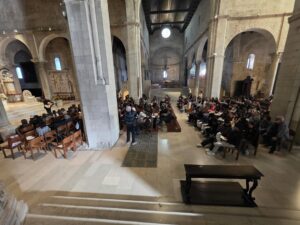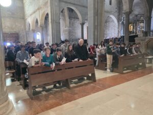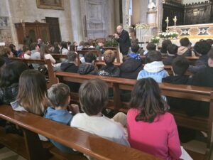 L’Arcivescovo ha poi ricordato che quest’anno ricorrono 1700 anni dal ritrovamento della croce di Cristo a Gerusalemme, avvenuto nel 326 grazie anche al contributo di San Ciriaco. Un frammento della croce è custodito nella stauroteca nella cripta dei Santi Patroni. Proprio lì si è svolto l’ultimo gesto. I ragazzi sono scesi nella cripta e si sono fermati in silenzio davanti alla reliquia. Ciascuno è stato invitato a rispondere all’amore di Dio con una preghiera personale: «Gesù ti voglio bene perché mi hai salvato, mi fai crescere bene con il tuo Vangelo e mi educhi alla pace». Poi l’invito ad allargare lo sguardo: pregare per la pace in un mondo segnato dalle guerre e affidare al Signore la propria famiglia, gli amici e tutte le persone che portano nel cuore.
