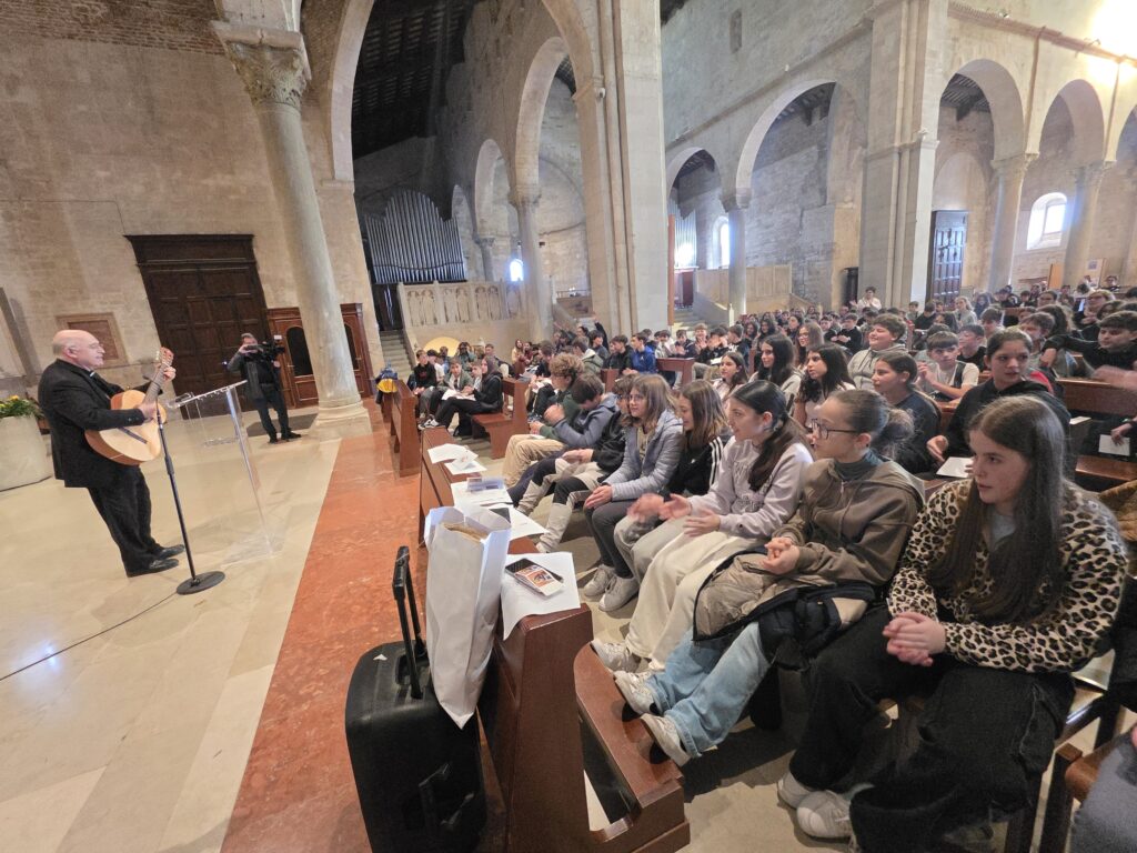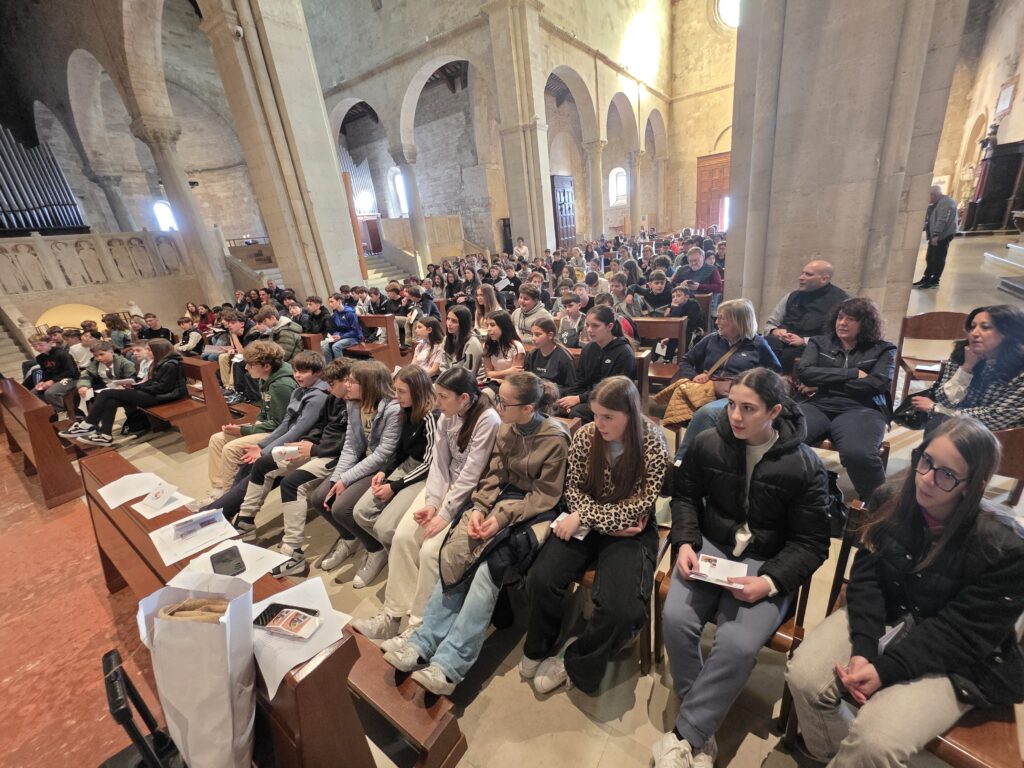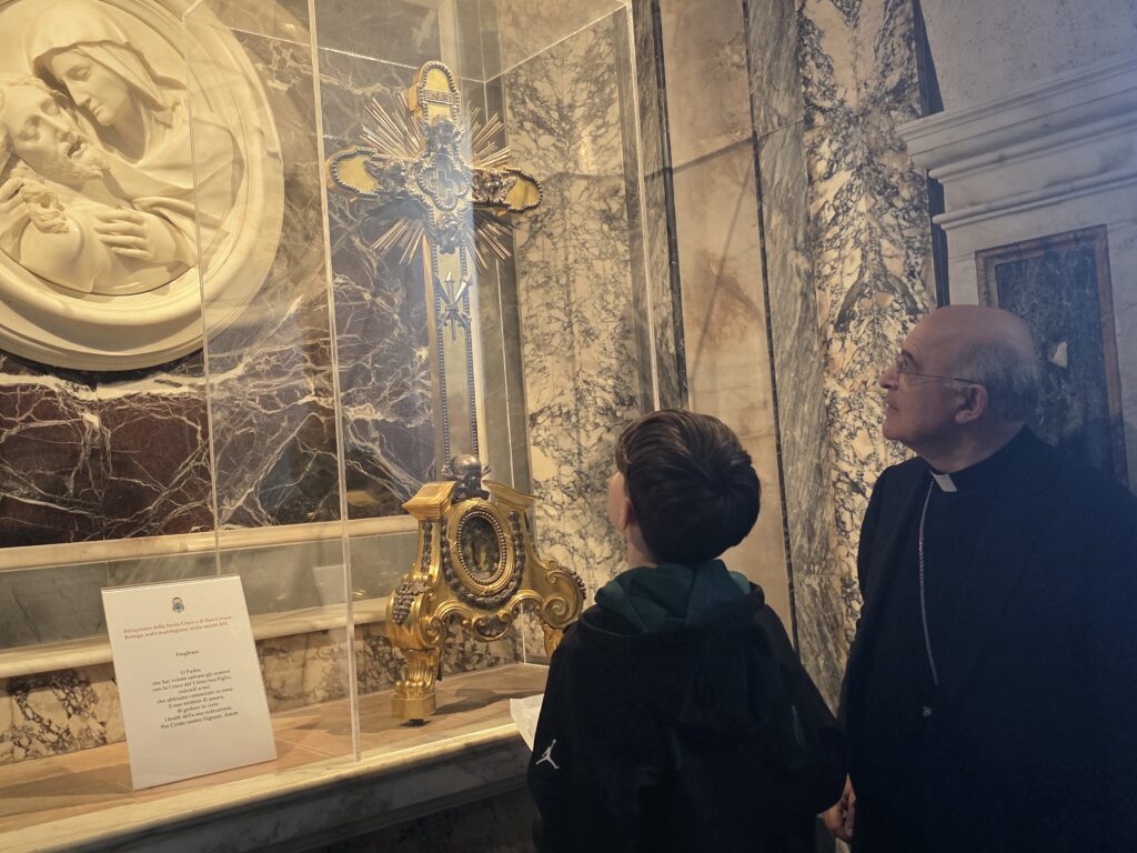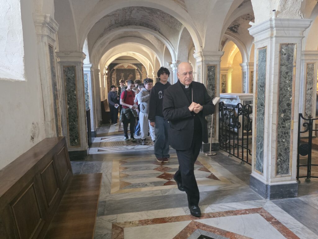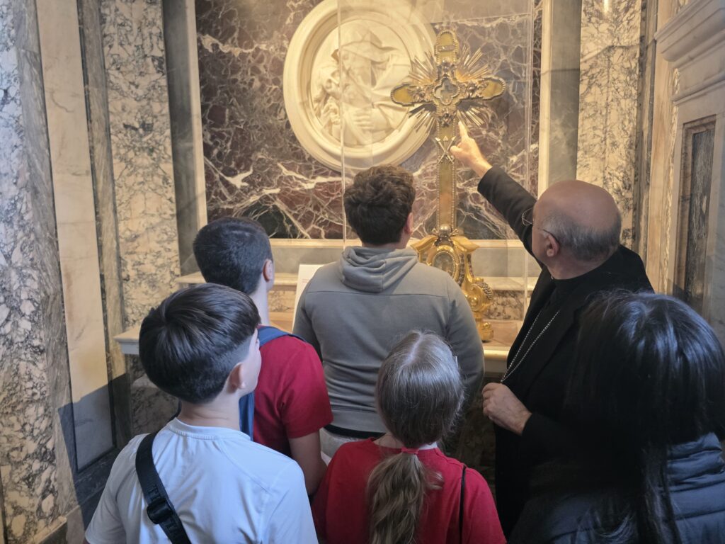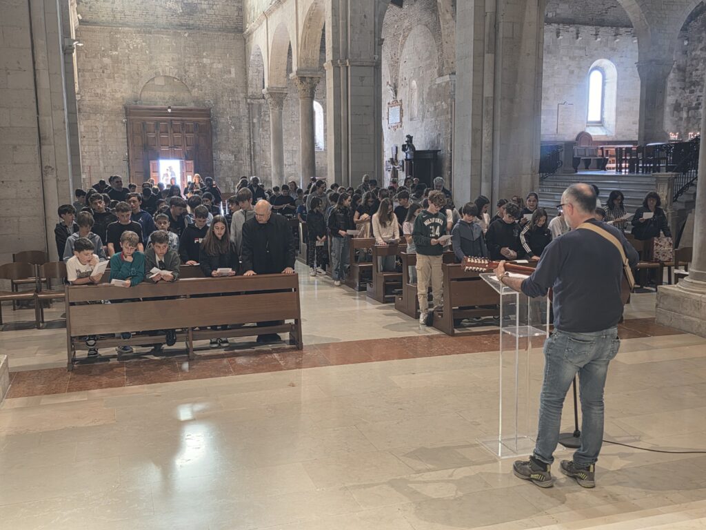 L’Arcivescovo ha poi ricordato che quest’anno ricorrono 1700 anni dal ritrovamento della croce di Cristo a Gerusalemme, avvenuto nel 326 grazie anche al contributo di San Ciriaco. Un frammento della croce è custodito nella stauroteca nella cripta dei Santi Patroni. Proprio lì si è svolto l’ultimo gesto. I ragazzi sono scesi nella cripta e si sono fermati in silenzio davanti alla reliquia. Ciascuno è stato invitato a rispondere all’amore di Dio con una preghiera personale: «Gesù ti voglio bene perché mi hai salvato, mi fai crescere bene con il tuo Vangelo e mi educhi alla pace». Poi l’invito ad allargare lo sguardo: pregare per la pace in un mondo segnato dalle guerre e affidare al Signore la propria famiglia, gli amici e tutte le persone che portano nel cuore.