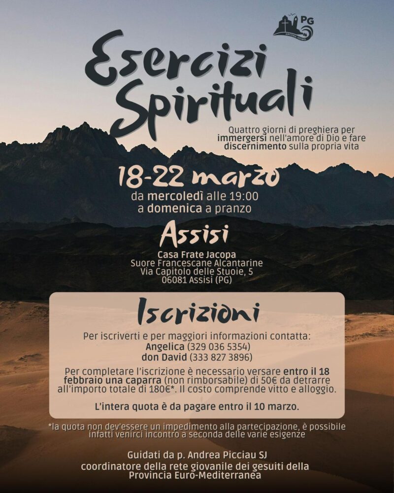 ✨ Quattro giorni di preghiera per immergerti con tutta la tua vita nell’amore di Dio. Imparare, tra domande e desideri, a camminare con lui. 🎯Guidati da p. Andrea Picciau, coordinatore della rete giovanile dei gesuiti della provincia euro-mediterranea. 👥 Per giovani dai 18 anni 🗓️ Da mercoledì 18 a domenica 22 marzo 🏠 Casa Frate Jacopa – Assisi 🤳Per iscrizioni contattare Angelica (329 0365354) o … Continua a leggere Esercizi spirituali per giovani