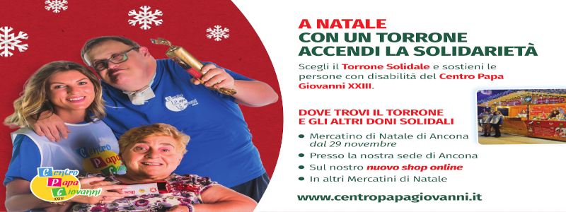 Al via la Campagna di Natale del Centro Papa Giovanni XXIII: dal 29 novembre presenti al Mercatino di Ancona. Debutta lo shop online per il Torrone Solidale. Il Centro Papa Giovanni XXIII dà ufficialmente il via alla Campagna di Natale 2025, un appuntamento importante che ogni anno coinvolge la comunità e permette di sostenere i progetti di autonomia e inclusione dedicati alle persone con disabilità. … Continua a leggere Campagna di Natale del Centro Papa Giovanni XXIII
