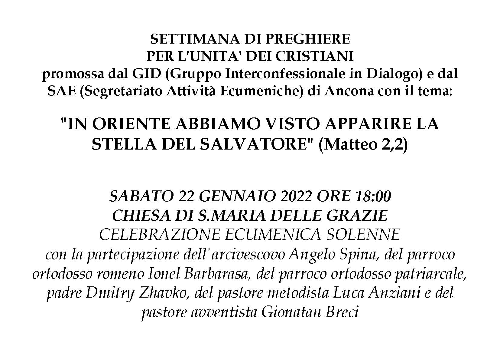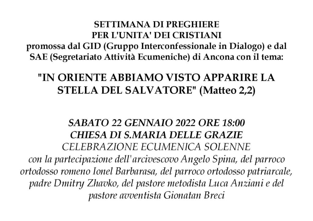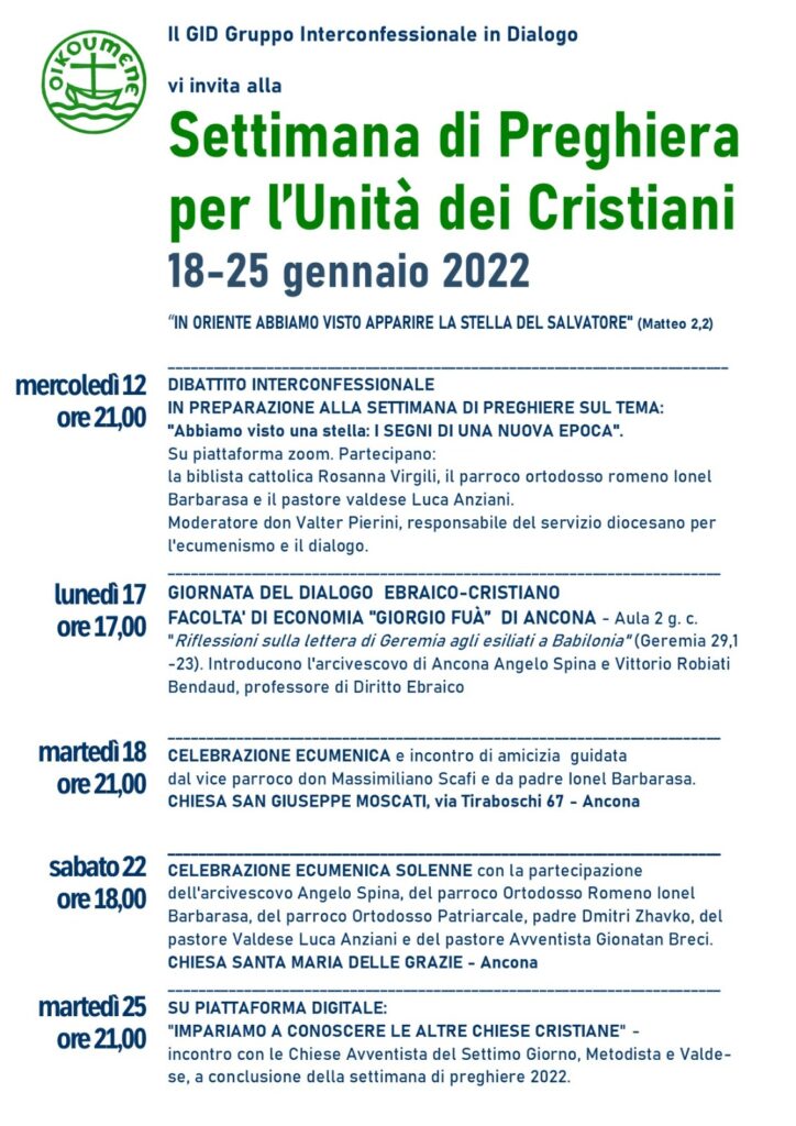 Ecumenismo 15 Gennaio 2022 admindiocesi Celebrazione ecumenica solenne sabato 22 Gennaio Descrizione: Inizio: 22/01/2022 18:00 Fine: 22/01/2022 20:00 Categorie: Ecumenismo Città: Ancona Regione: Marche Paese: Italia CONDIVIDIemailPrintFacebookTwitter