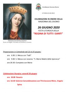 Pubblichiamo il volantino relativo alla festa liturgica della “Regina di tutti i Santi ” che si celebra ogni anno il 26 giugno nella Cattedrale ad Ancona.
