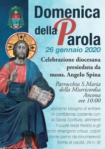 Domenica 26 gennaio 2020, in occasione della giornata annuale della Parola promossa da papa Francesco per una più approfondita e capillare conoscenza della Parola di Dio, presso la Parrocchia di S.Maria della Misericordia ad Ancona alle ore 10:00, si terrà una solenne celebrazione diocesana presieduta dal nostro Arcivescovo Angelo Spina.