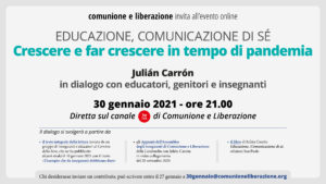 Su iniziativa di alcuni insegnanti di Comunione e Liberazione, sabato 30 gennaio alle ore 21:00, si terrà un incontro pubblico online dal titolo: “Educazione, comunicazione di sé. Crescere e far crescere in tempo di pandemia”. Sarà un dialogo con Julián Carrón sulle tante provocazioni che stanno emergendo in questo periodo, a partire dalla situazione della scuola: l’emergenza educativa riguarda tutti noi, non solo “gli addetti ai lavori”.