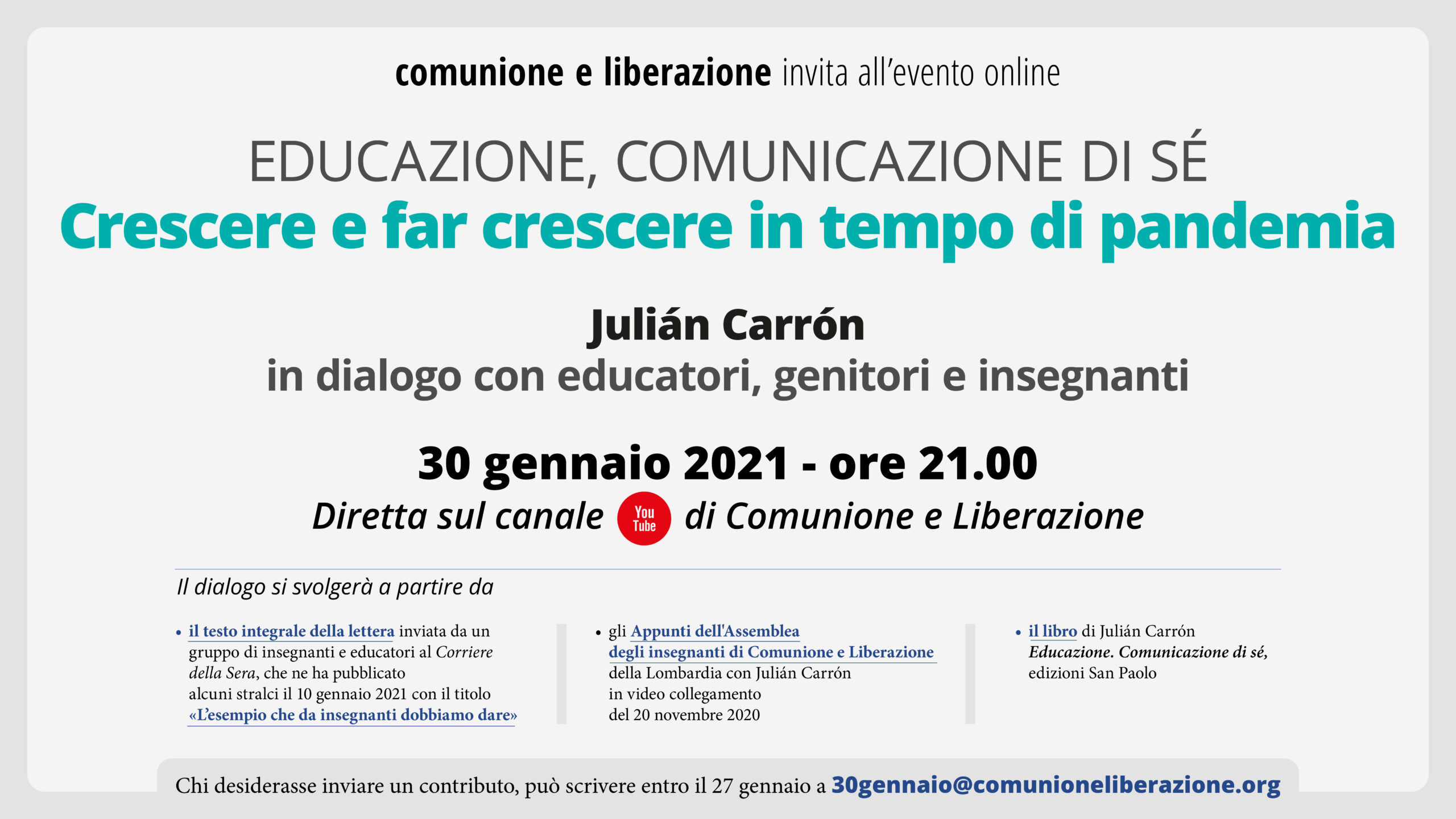 Su iniziativa di alcuni insegnanti di Comunione e Liberazione, sabato 30 gennaio alle ore 21:00, si terrà un incontro pubblico online dal titolo: “Educazione, comunicazione di sé. Crescere e far crescere in tempo di pandemia”. Sarà un dialogo con Julián Carrón sulle tante provocazioni che stanno emergendo in questo periodo, a partire dalla situazione della scuola: l’emergenza educativa riguarda tutti noi, non solo “gli addetti ai lavori”.