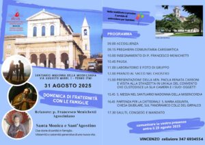 Nella mattina si condividerà la preghiera comunitaria carismatica e si potranno conoscere le storie di santità di Santa Monica e Sant’Agostino, sotto il profilo della maternità e della paternità spirituale a cui ciascun battezzato è chiamato, guidati da Padre Francesco Menichetti, agostiniano.