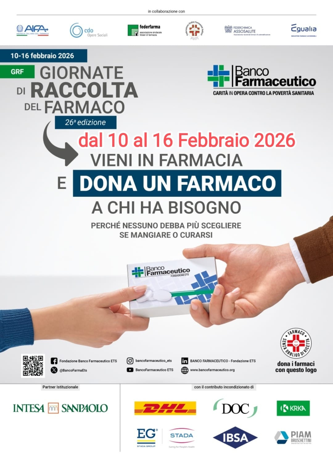Anche quest’anno, si svolgeranno le GRF – Giornate di Raccolta del Farmaco. Dureranno una settimana, da martedì 10 a lunedì 16 febbraio 2026.