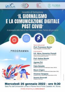 Per l’occasione si propone un incontro in diretta streaming sul tema “Il giornalismo e la comunicazione digitale post Covid”. L’appuntamento è per il giorno 26 febbraio 2022 alle ore 9.30 sul sito www.weca.it