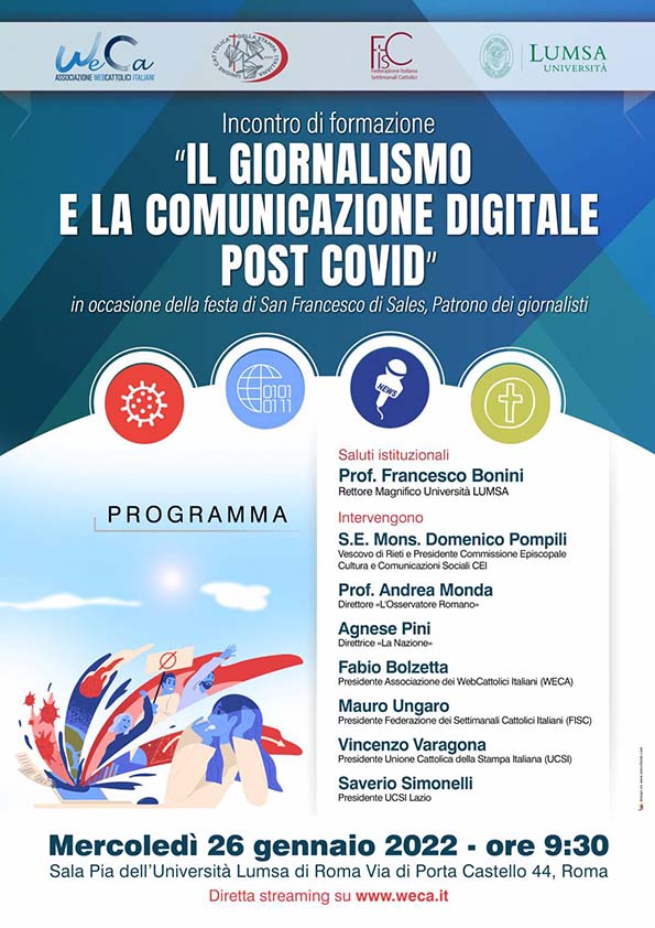 Per l’occasione si propone un incontro in diretta streaming sul tema “Il giornalismo e la comunicazione digitale post Covid”. L’appuntamento è per il giorno 26 febbraio 2022 alle ore 9.30 sul sito www.weca.it