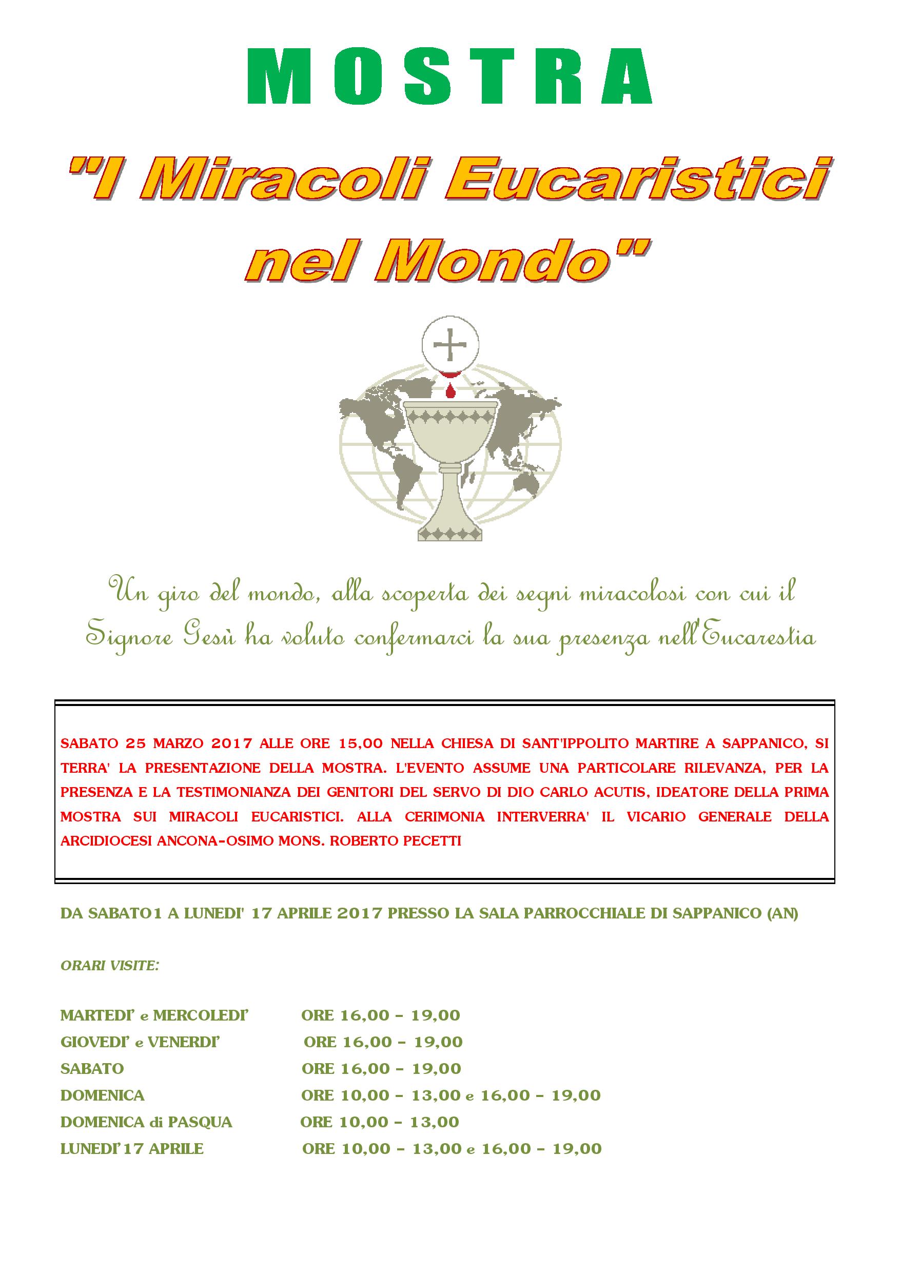 Eventi parrocchiali 14 Marzo 2017 andreaf Inaugurazione della mostra: I miracoli eucaristici nel mondo sabato 25 Marzo Inizio: 25/03/2017 00:00 Fine: 25/03/2017 23:59 Categorie: Eventi parrocchiali CONDIVIDIemailPrintFacebookTwitter
