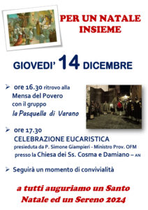 “per vivere insieme questo momento natalizio e ringraziare tutti gli amici per la preziosa collaborazione, giovedì 14 dicembre alle ore 16:30 ci ritroveremo davanti alla Mensa P. Guido allietati dal gruppo della Pasquella di Varano, poi insieme andremo verso la Chiesa dei Ss. Cosma e Damiano dove P. Simone Giampieri, Ministro Provinciale dei Frati Minori, celebrerà l’Eucaristia alle ore 17:30. A seguire, nel teatrino della stessa chiesa, ci sarà un momento di fraternità”.