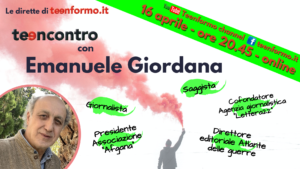 Dalla Parrocchia S. Croce (Via del Conero, 32 Ancona- zona Pietralacroce) riceviamo comunicazione relativa all’incontro/intervista, che si terrà online venerdì 16 aprile dalle ore 20.45 alle ore 21.45, sarà il secondo (dopo quello organizzato con Raffaele Crocco) realizzato dal gruppo di giovani di teenformo.it ed avrà come protagonista Emanuele Giordana giornalista, saggista, cofondatore dell’Agenzia giornalistica “Lettera22” ed esperto di Afghanistan e Myanmar.