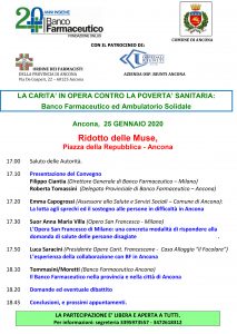 Ad Ancona, il 25 gennaio 2020 alle ore 17:00 al Ridotto del teatro delle Muse (Google Maps), in occasione dei 20 anni della ONLUS “Banco Farmaceutico”, si svolgerà un convegno dal titolo “La carità in opera contro la povertà sanitaria”. Un tema quanto mai attuale, preso inizialmente in carico da volontari che oggi più che mai a 20 anni dalla fondazione del Banco Farmaceuto, richiede l’attenzione attiva di enti e istituzioni. Si confronteranno oltre ai membri del Banco Farmaceutico, l’opera S.Francesco di Milano, le Opere Caritative Francescane per “Il Samaritano” e l’Assessore alla salue e servizi sociali del Comune di Ancona.