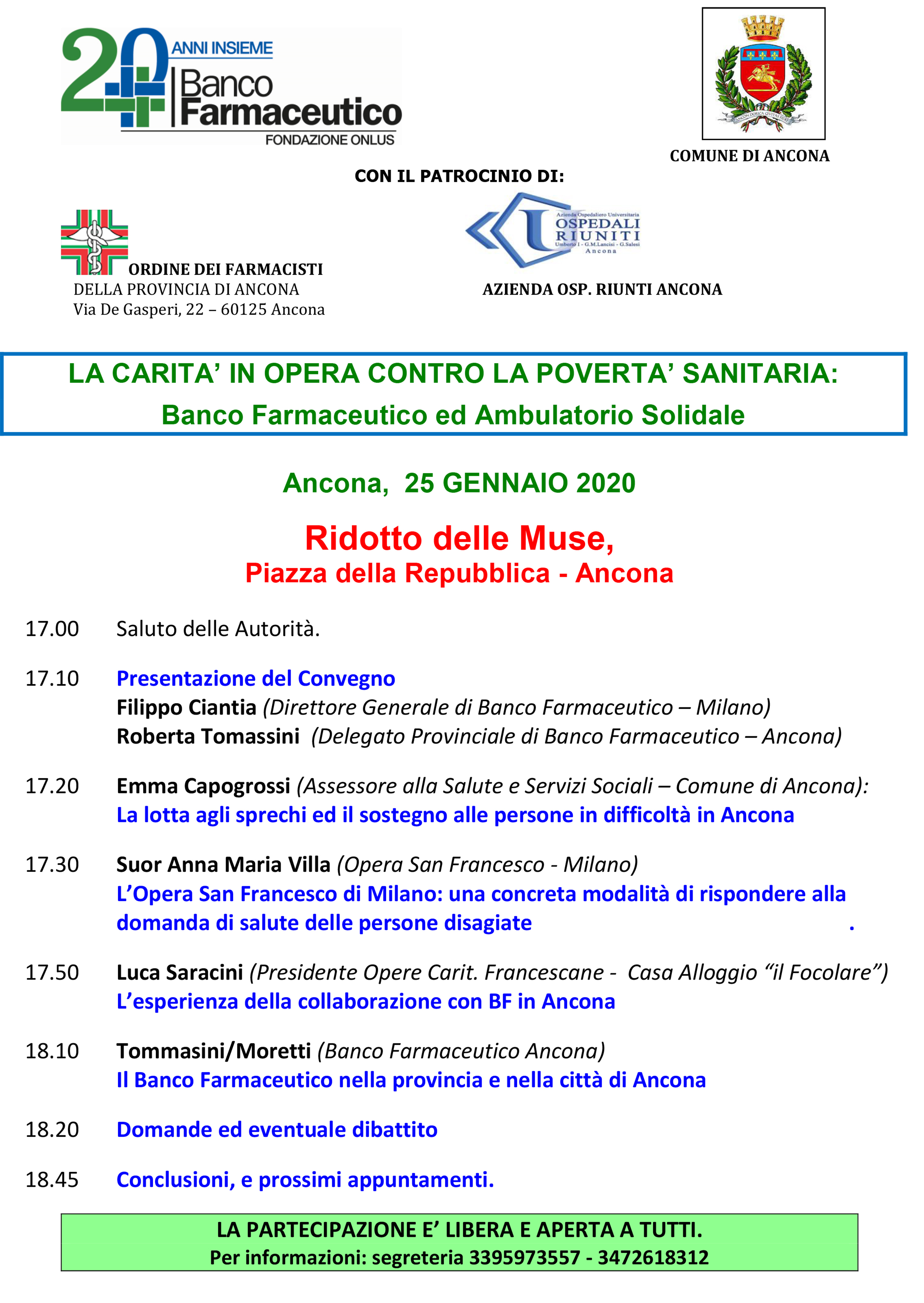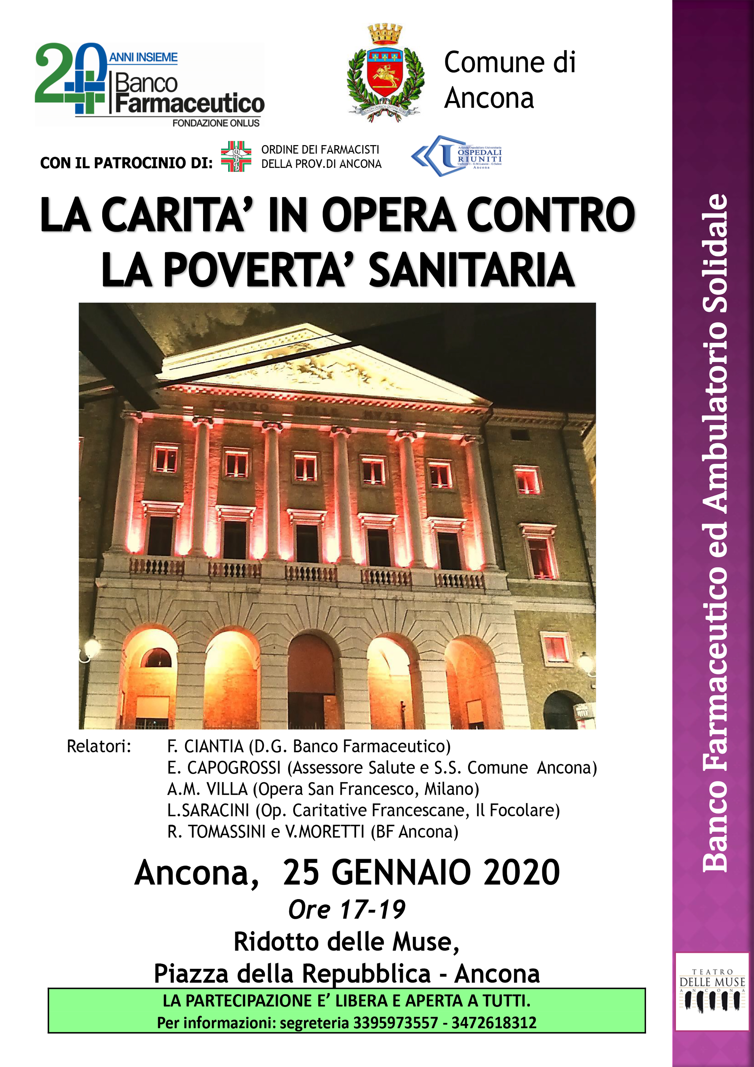 Ad Ancona, il 25 gennaio 2020 alle ore 17:00 al Ridotto del teatro delle Muse (Google Maps), in occasione dei 20 anni della ONLUS “Banco Farmaceutico”, si svolgerà un convegno dal titolo “La carità in opera contro la povertà sanitaria”. Un tema quanto mai attuale, preso inizialmente in carico da volontari che oggi più che mai a 20 anni dalla fondazione del Banco Farmaceuto, richiede l’attenzione attiva di enti e istituzioni. Si confronteranno oltre ai membri del Banco Farmaceutico, l’opera S.Francesco di Milano, le Opere Caritative Francescane per “Il Samaritano” e l’Assessore alla salue e servizi sociali del Comune di Ancona.