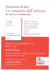 Presentazione del libro “La conquista dell’infanzia” di Nicola Campagnoli, sabato 14 dicembre alle ore 17:30 al Museo Diocesano di Ancona (Google Maps).