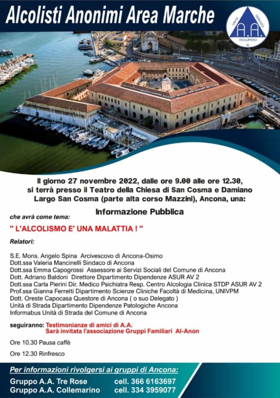 L’associazione AA Alcolisti Anonimi dell’area Marche organizza presso il teatrino della Chiesa dei Santi Cosma e Damiano ad Ancona, per il giorno 27 novembre 2022 dalle ore 9 alle 12:30, un incontro sul tema “L’alcolismo è una malattia! ” con la partecipazione di numerosi relatori per altrettante aree di intervento. Previste anche testimonianze e condivisioni su questo importante problema.Il volantino che alleghiamo offre una precisa panoramica dell’evento e contatti.