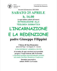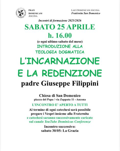Sabato 25 aprile alle 16.00 nella chiesa di San Domenico (con ingresso da piazza del Papa e da via Zappata 11) nuovo appuntamento con gli Incontri di formazione della Fraternita laica San Domenico, aperti a tutti, tenuti da padre Giuseppe Filippini, assistente spirituale della Fraternita, che nell’occasione parlerà sul tema:Introduzione alla Teologia Dogmatica