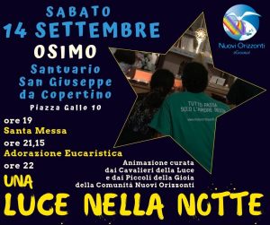 Nell’ambito della festa in onore di S.Giuseppe da Copertino, la Comunità Nuovi Orizzonti, organizza per sabato 14 settembre 2019, un tempo di preghiera e di animazione: Luci nella Notte.