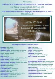 Dalle parrocchie di S.Pietro in S.Francesco alle Scale e Cosma e Damiano, giunge l’invito ad uno spettacolo a cura del laboratorio teatrale “El picinì” che presenta, come cita il volantino, “un atto unico con momenti di poesia” presso il teatrino in via Fanti alto, domenica 28 maggio ’23 alle ore 16.