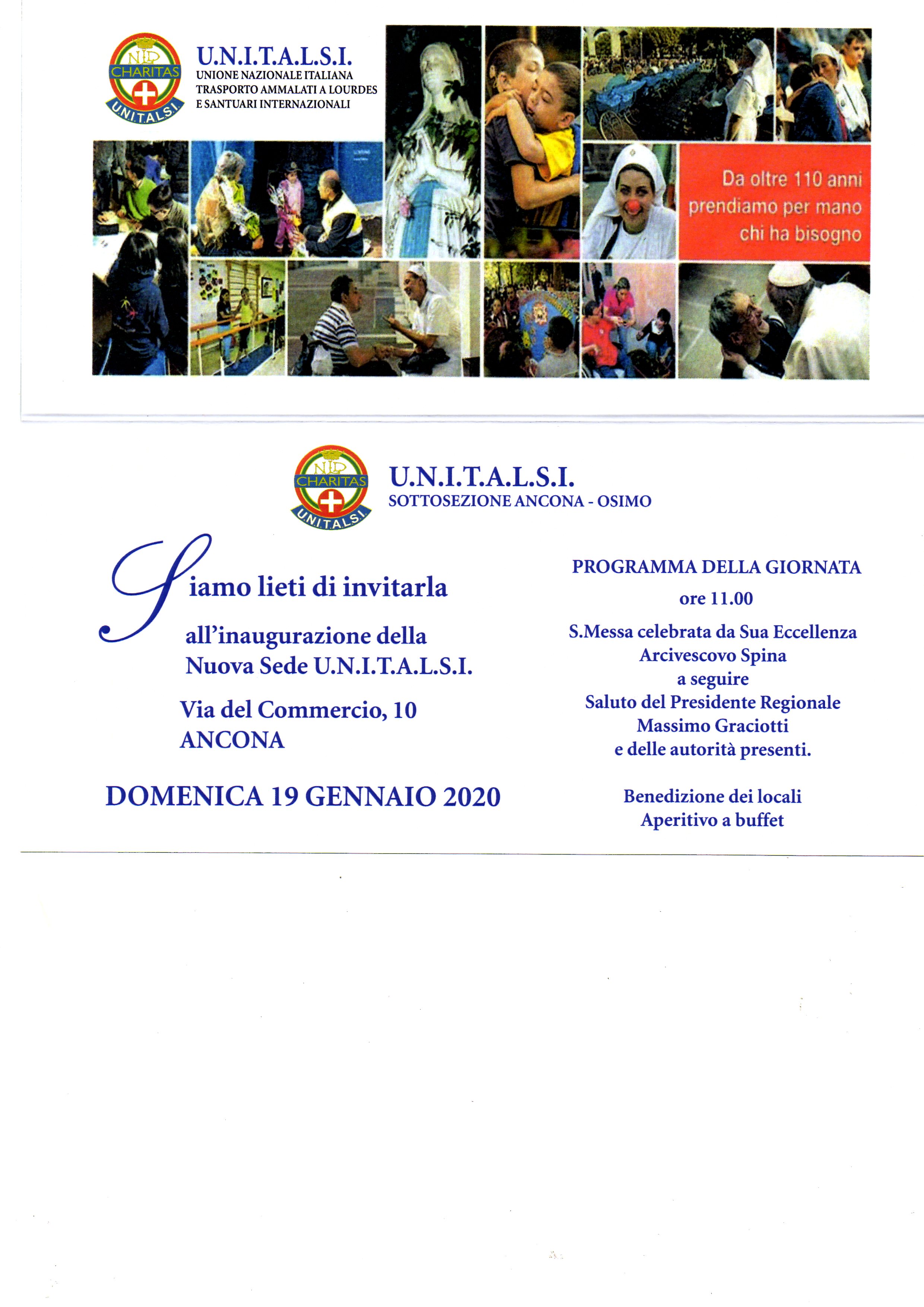 Per chi è interessato, pubblichiamo l’invito all’inaugurazione della nuova sede UNITALSI sottosezione Ancona Osimo, il 19 gennaio 2020, in via del Commercio (Google Maps).