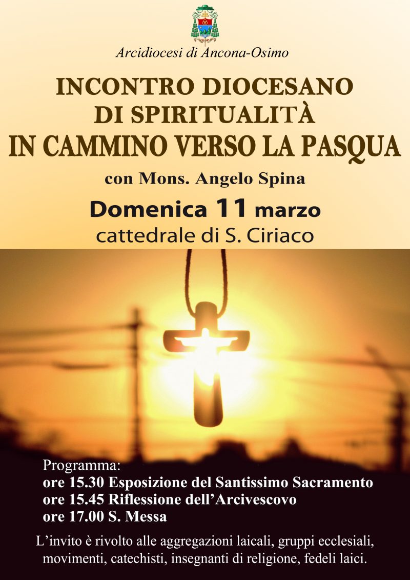 Domenica 11 marzo dalle ore 15.30 si terrà l’incontro diocesano di spiritualità “IN CAMMINO VERSO LA PASQUA”, guidato dal nostro Arcivescovo Mons. Angelo Spina. Sono invitati a partecipare le aggregazioni laicali, i gruppi ecclesiali, i movimenti, i catechisti, gli insegnanti di religione e i fedeli laici