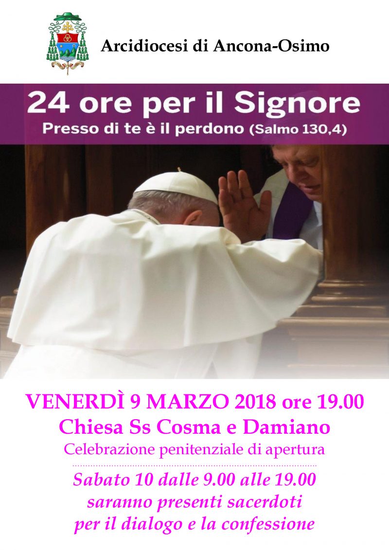 Come auspicato da papa Francesco nella lettera per la Quaresima 2018 anche nella nostra Diocesi si svolgerà l’iniziativa “24 ore per il Signore” ispirandosi alle parole del Salmo 130,4: «Presso di te è il perdono». Nella Chiesa di SS.Cosma e Damiano, ad Ancona, si vivrà questo momento da venerdì 9 marzo, alle ore 19 con la celebrazione penitenziale comunitaria di apertura, fino alle 19 di … Continua a leggere sabato10Marzo 00:00 24 ore per il Signore 10/03/2018 00:00 »