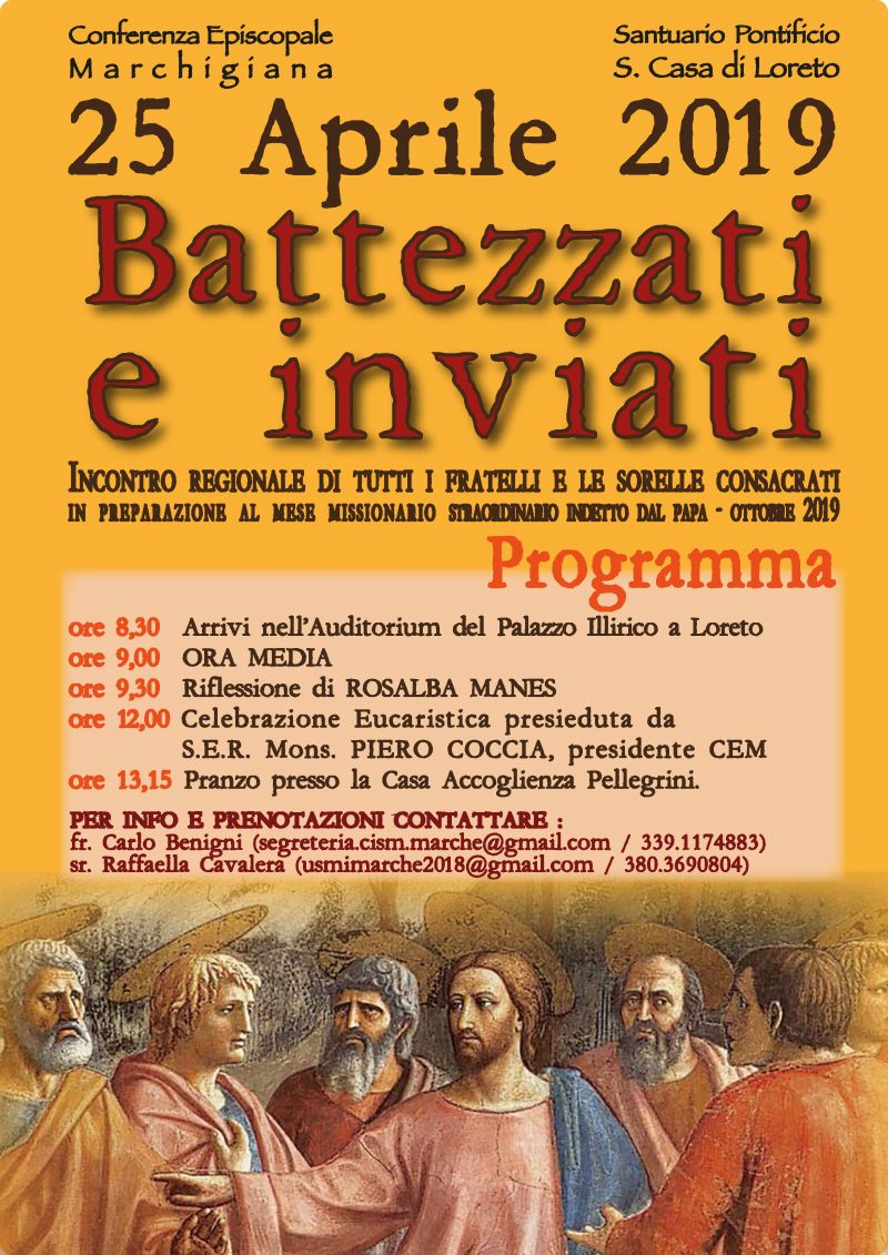 INCONTRO REGIONALE DI TUTTI I FRATELLI E LE SORELLE CONSACRATI IN PREPARAZIONE AL MESE MISSIONARIO STRAORDINARIO INDETTO DAL PAPA – OTTOBRE 2019 Programma ore 8,30 Arrivi nell’Auditorium del Palazzo Illirico a Loreto ore 9,00 ORA MEDIA ore 9,30 Riflessione di ROSALBA MANES ore 12,00 Celebrazione Eucaristica presieduta da S.E.R. Mons. PIERO COCCIA, presidente CEM ore 13,15 Pranzo presso la Casa Accoglienza Pellegrini. PER INFO E … Continua a leggere giovedì25Aprile 00:00 Battezzati e inviati 25/04/2019 00:00 »