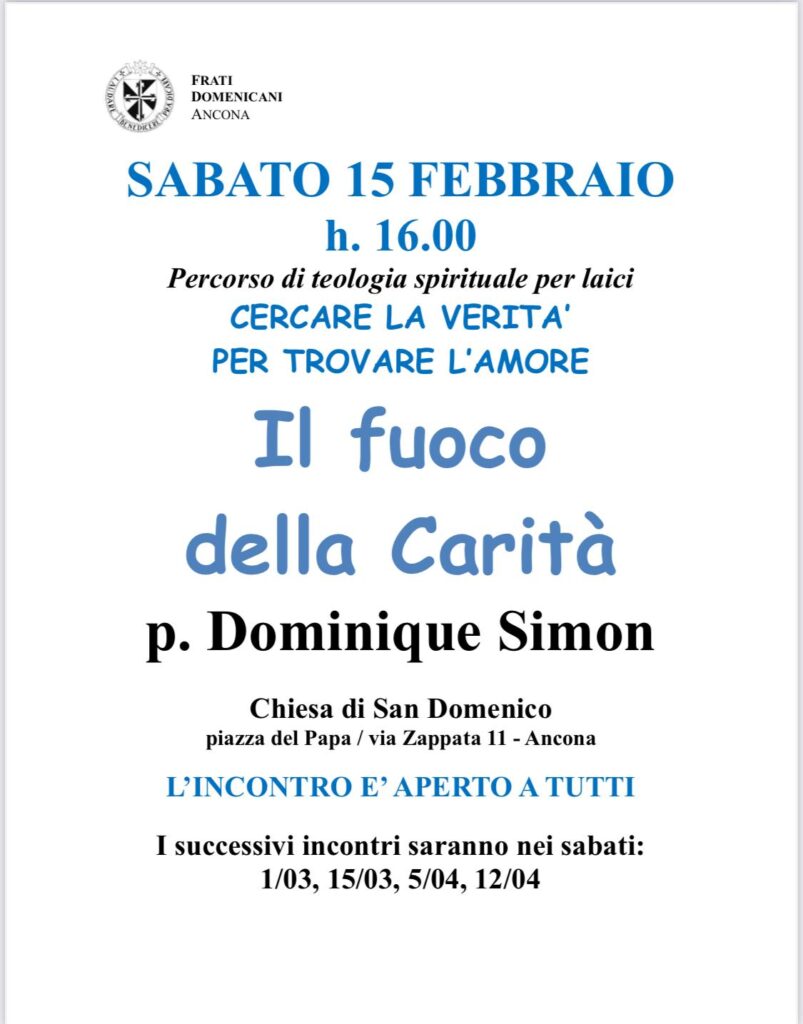 Sabato 15 febbraio, alle 16 nella chiesa di San Domenico, (ingresso da piazza del Papa e da via Zappata 11) si terrà il 7° incontro del Percorso di teologia spirituale per laici “Cercare la Verità per trovare l’Amore”, guidato da padre Dominique Simon, questa volta sul tema: “Il fuoco della carità”.
